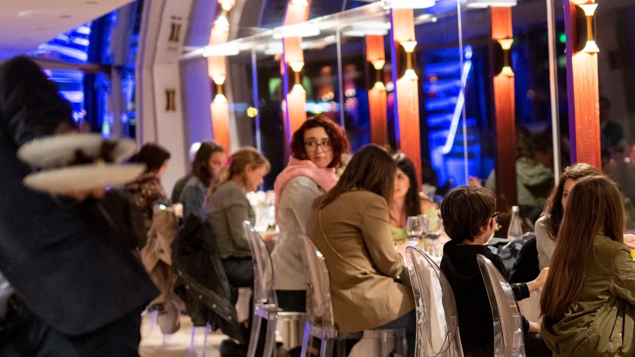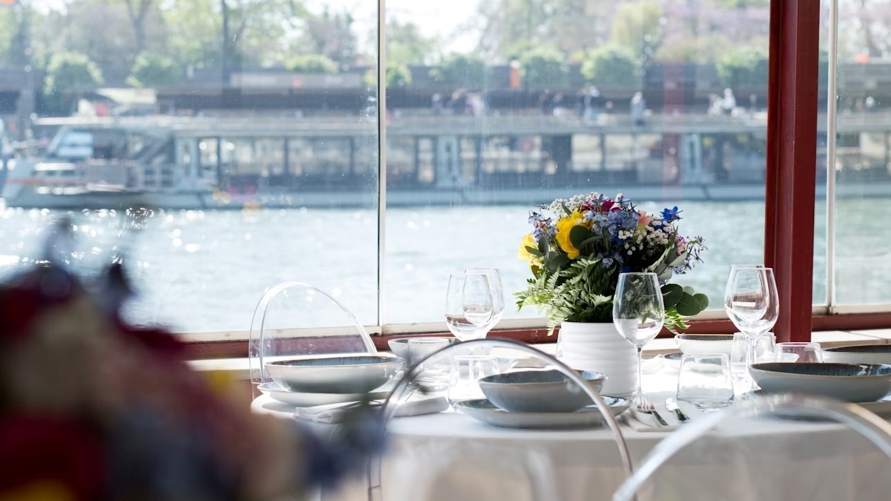 坐在座位上一边用餐一边欣赏塞纳河和巴黎地标的美景
