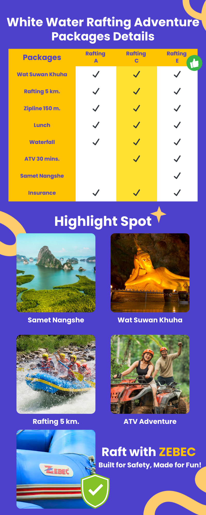 准备好迎接充满活力的一天,从普吉岛接您开始,并享用美味的午餐,为您的冒险之旅加油!使用 Zebec 的高品质装备征服 5 公里惊心动魄的白水漂流,并通过添加 ATV 游乐设施、滑索将您的乐趣提升到一个新的水平。在攀牙湾最令人惊叹的打卡地点 Samet Nangshe 拍摄令人惊叹的照片。不只是参观,而是令人难忘!