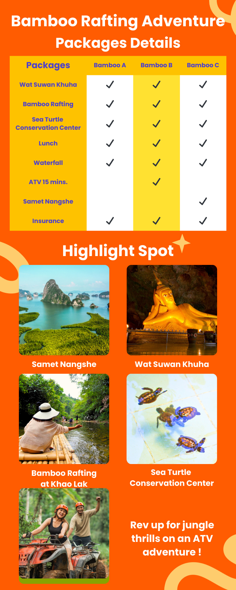 准备好迎接充满难忘冒险的一天吧!在 Khaolak Wang Maeng Phu 的竹筏上平静地滑行,周围环绕着郁郁葱葱的大自然。参观攀牙海龟保护中心,了解保护这些可爱生物的努力。选择全地形车 (ATV) 骑行等活动增添更多刺激,不要忘记在 Samet Nangshe 停留,欣赏令人惊叹的景色和必拍照片。提供从普吉岛出发的全方位服务和美味午餐,这是您不容错过的终极外出日!