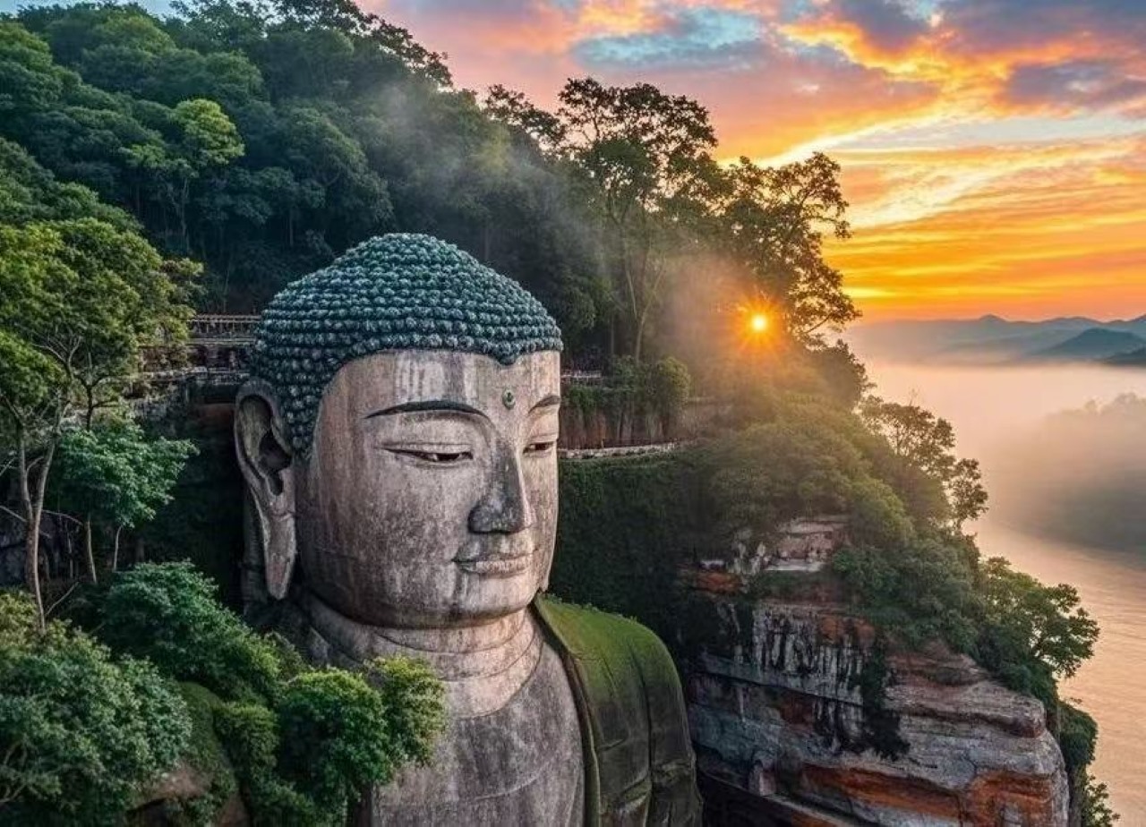 观赏乐山大佛的日出是一种非常特别的体验,尤其是在火烧云(即日出或日落时天空中出现的红色、橙色等暖色调的云彩)的映衬下,整个景色会显得格外壮观