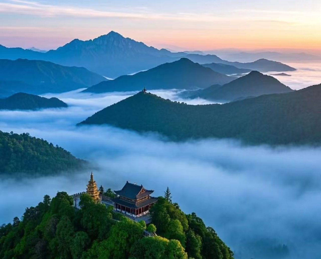 金顶的云海翻滚,阳光穿透云雾形成神秘“佛光”,仿佛站在天宫边缘!清晨的日出更是绝美,霞光染红云海,直接封神