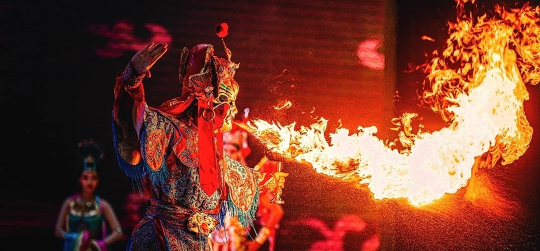 古蜀吐火的表演形式丰富,艺术技巧独特。演员戴着特殊设计的面具,扮演神仙、妖魔、魔怪等神秘角色,服装华丽特殊,将角色的超自然身份展现得淋漓尽致,突出个性和情感。