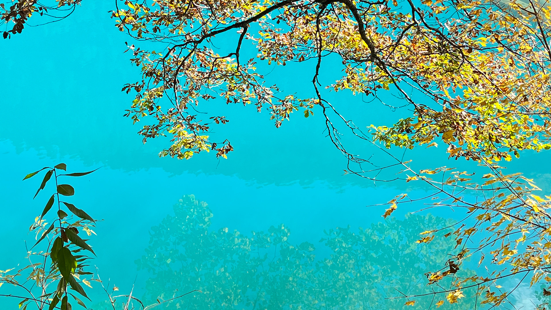 九寨沟有宝蓝湖水、洁白雪山、墨绿森林、湛蓝天空,山水交相辉映,如诗如画