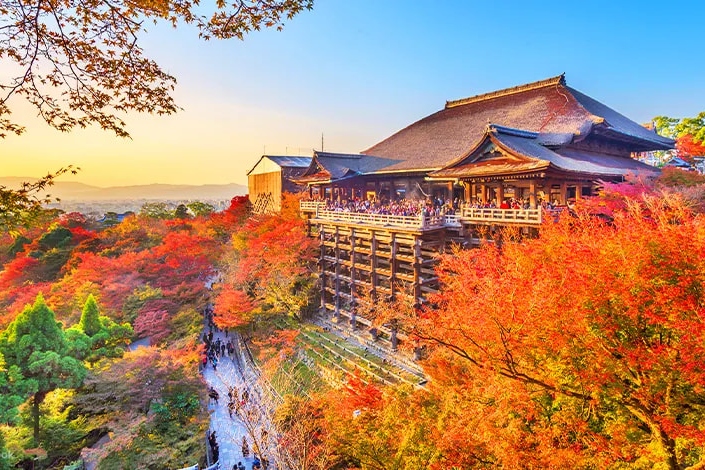 邂逅萌鹿京都奈良一日游:前往清水寺区域,秋季的清水寺满山遍野的红叶,美不胜收。来到日本不得不来一次和服体验,漫步古街,留下最美的一刻!