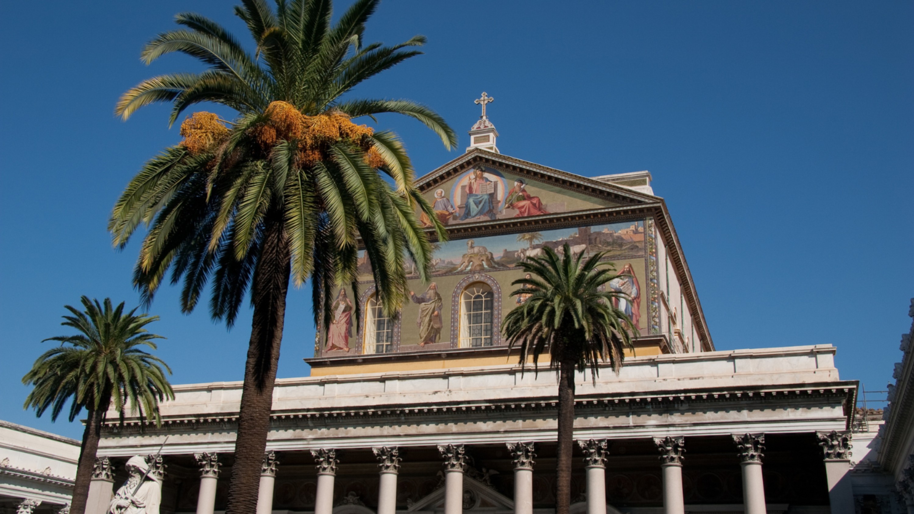 罗马大教堂令人惊叹的正面,周围环绕着棕榈树,在充满活力的蓝天下