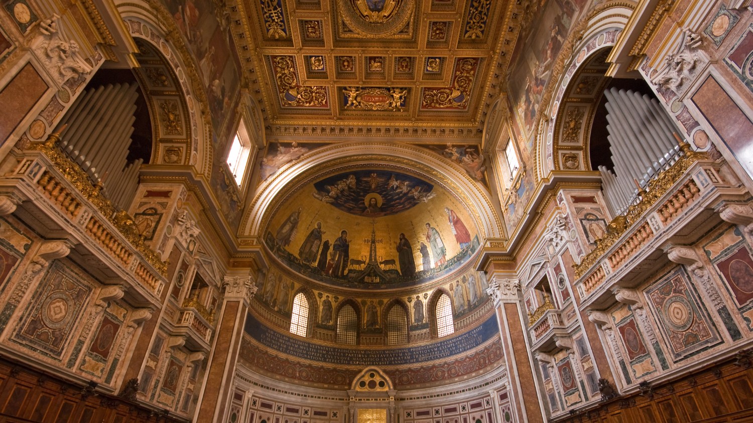 雄伟的大教堂内部装饰着复杂的马赛克、金色的细节和华丽的风琴管