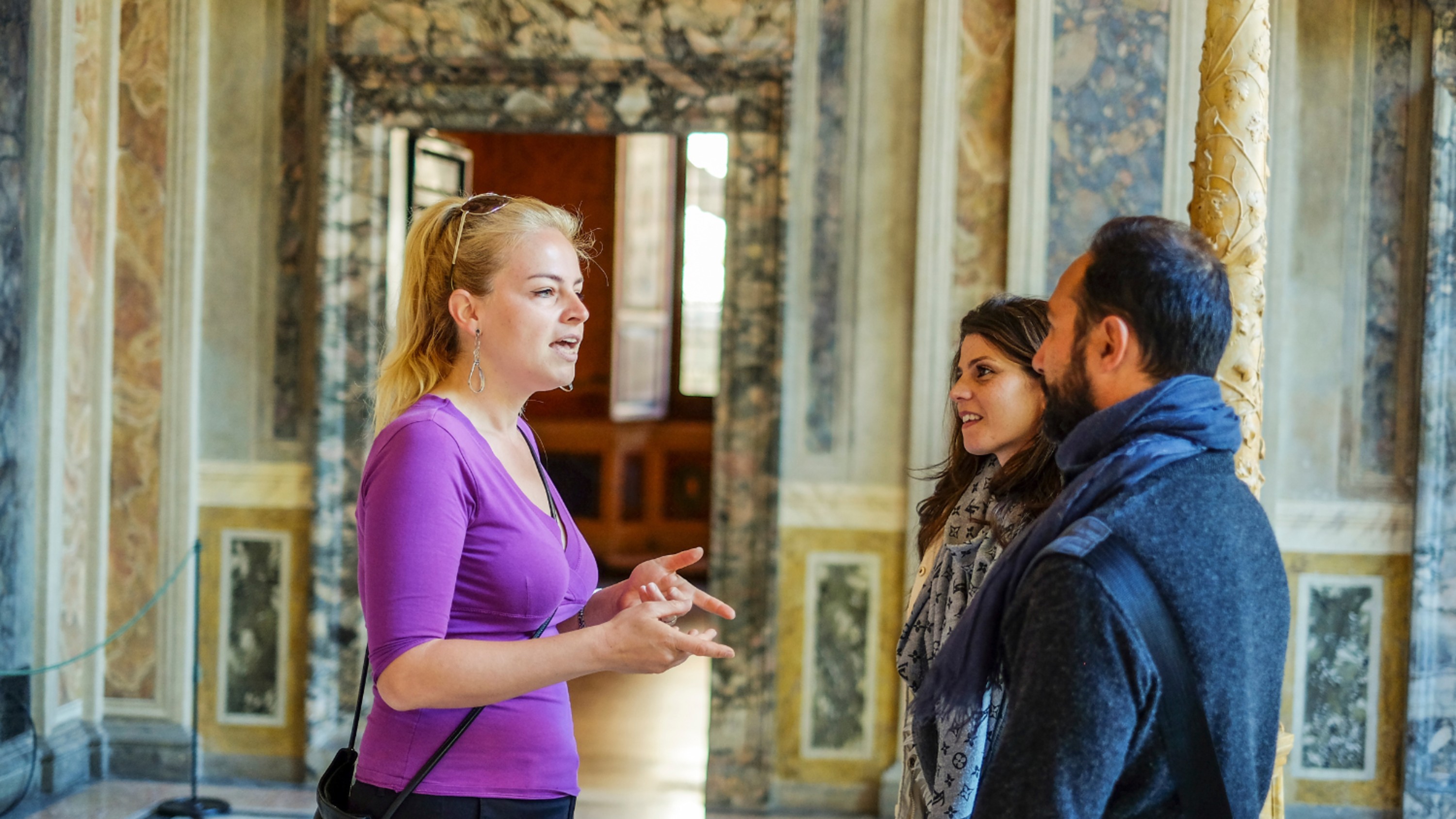迷人的导游在罗马大教堂令人惊叹的内部装饰中与游客分享迷人的故事