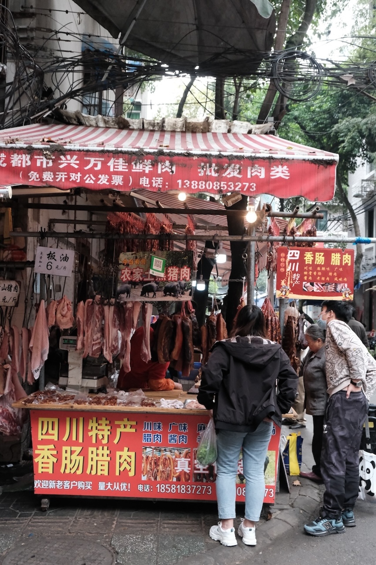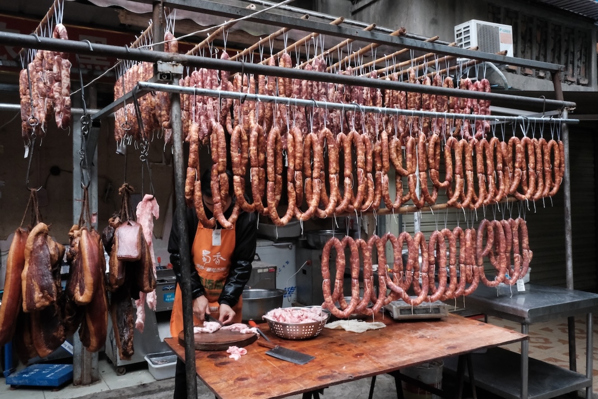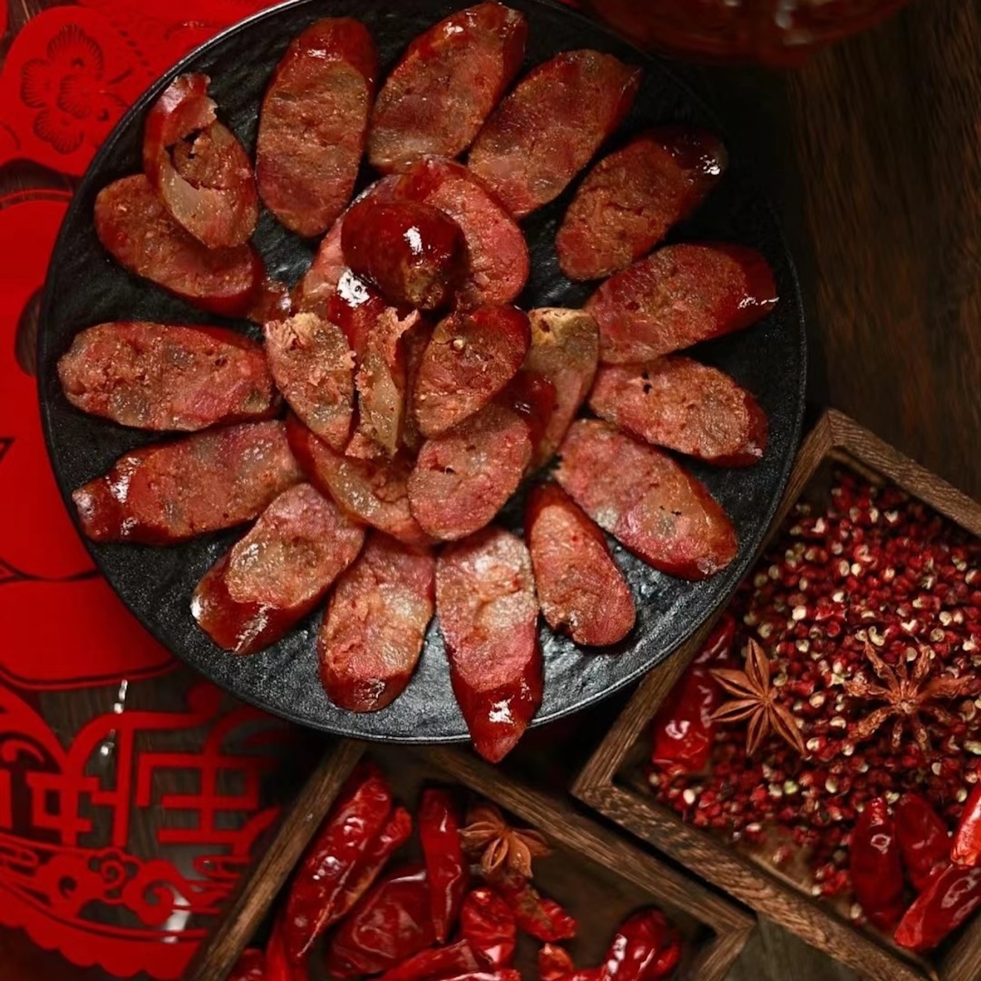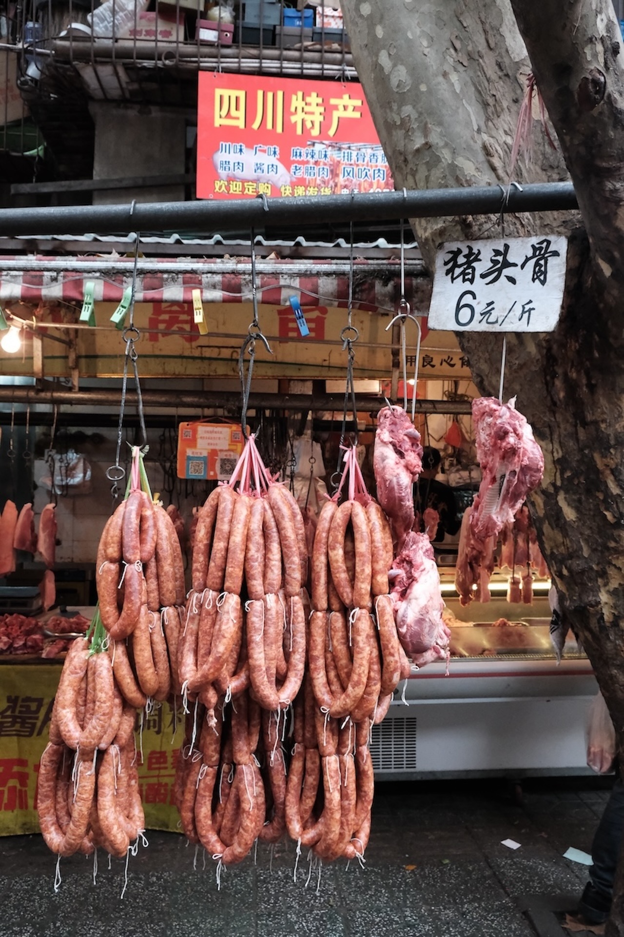四川人过年一定不能少的就香肠腊肉。春节前的2-3个月,当你走在成都的老城区,就能看到家家户户的窗户上,阳台上,树枝上,甚至电线杆上,都挂满了红彤彤的香肠。如果你去到当地的菜市场,就能看到所有的肉摊都在灌香肠。
