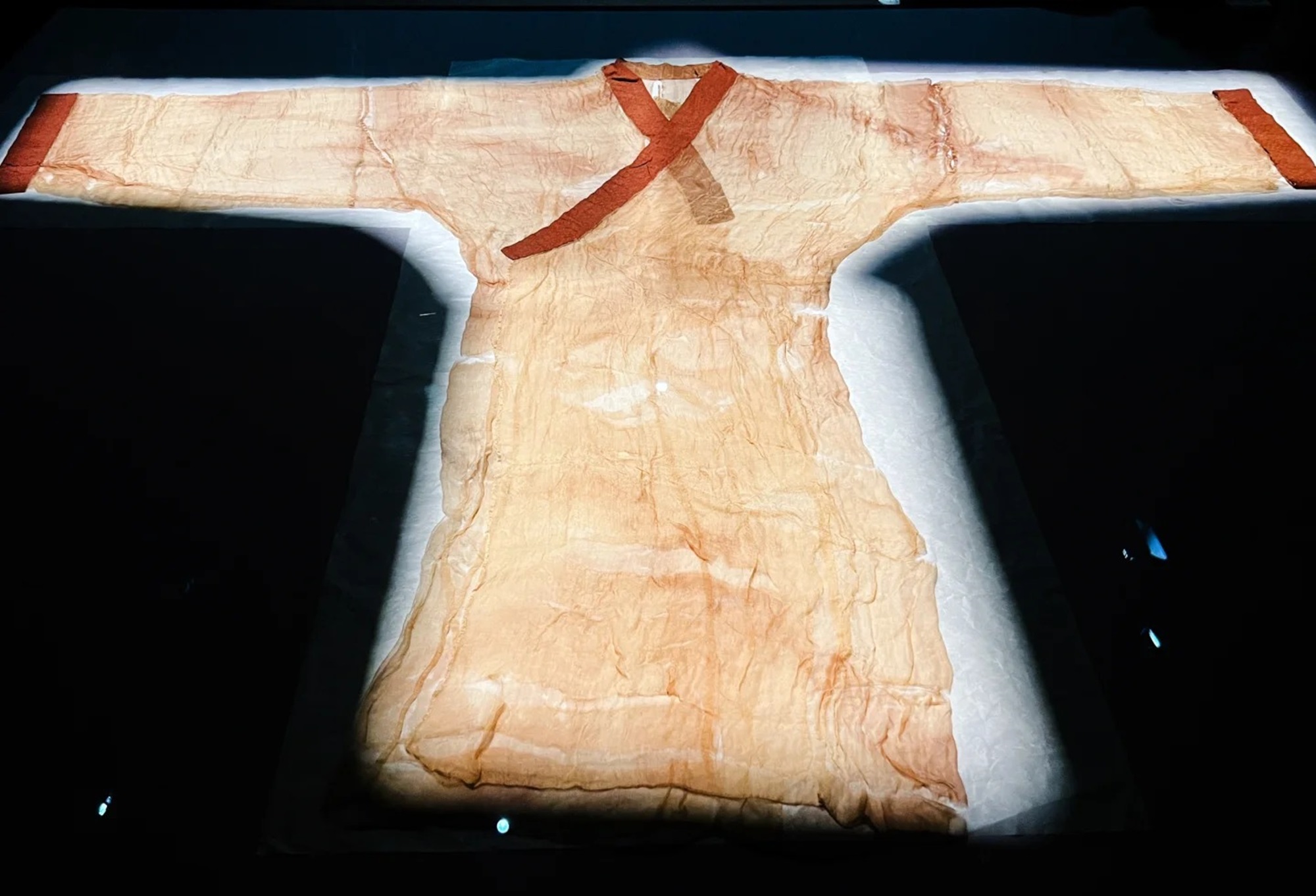 素纱单衣,它只有四十多毫克,真的很惊艳,丝丝的线织在一起,两层叠在一起,薄薄的都可以透出光来,不禁感叹古人的智慧啊,如果把它揉成一团,它只有一个鸡蛋那么大