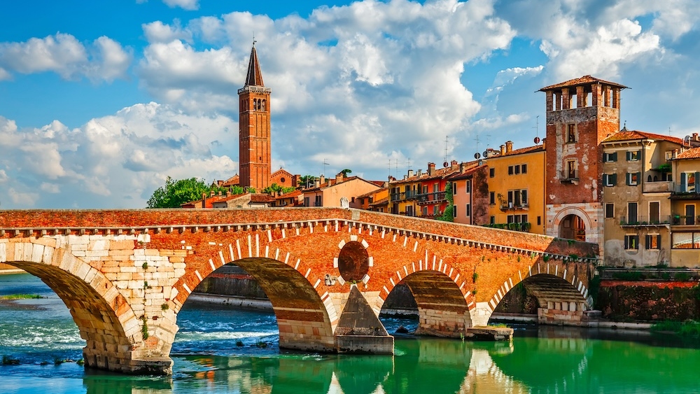 维罗纳一座迷人的桥梁,背后是该镇的历史建筑和屋顶