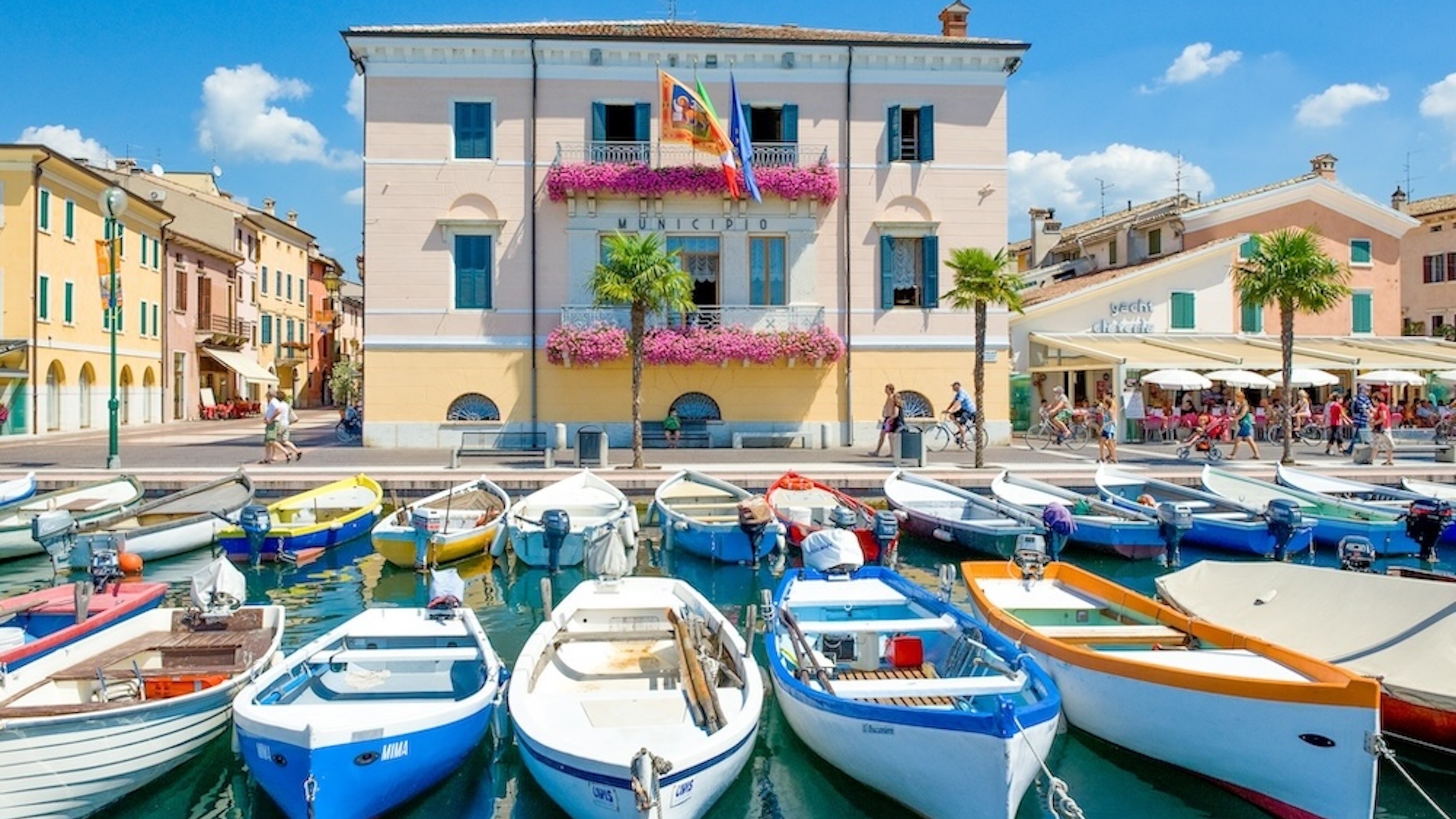 色彩斑斓的船只排列在加尔达湖畔,映衬着湖岸的活力魅力