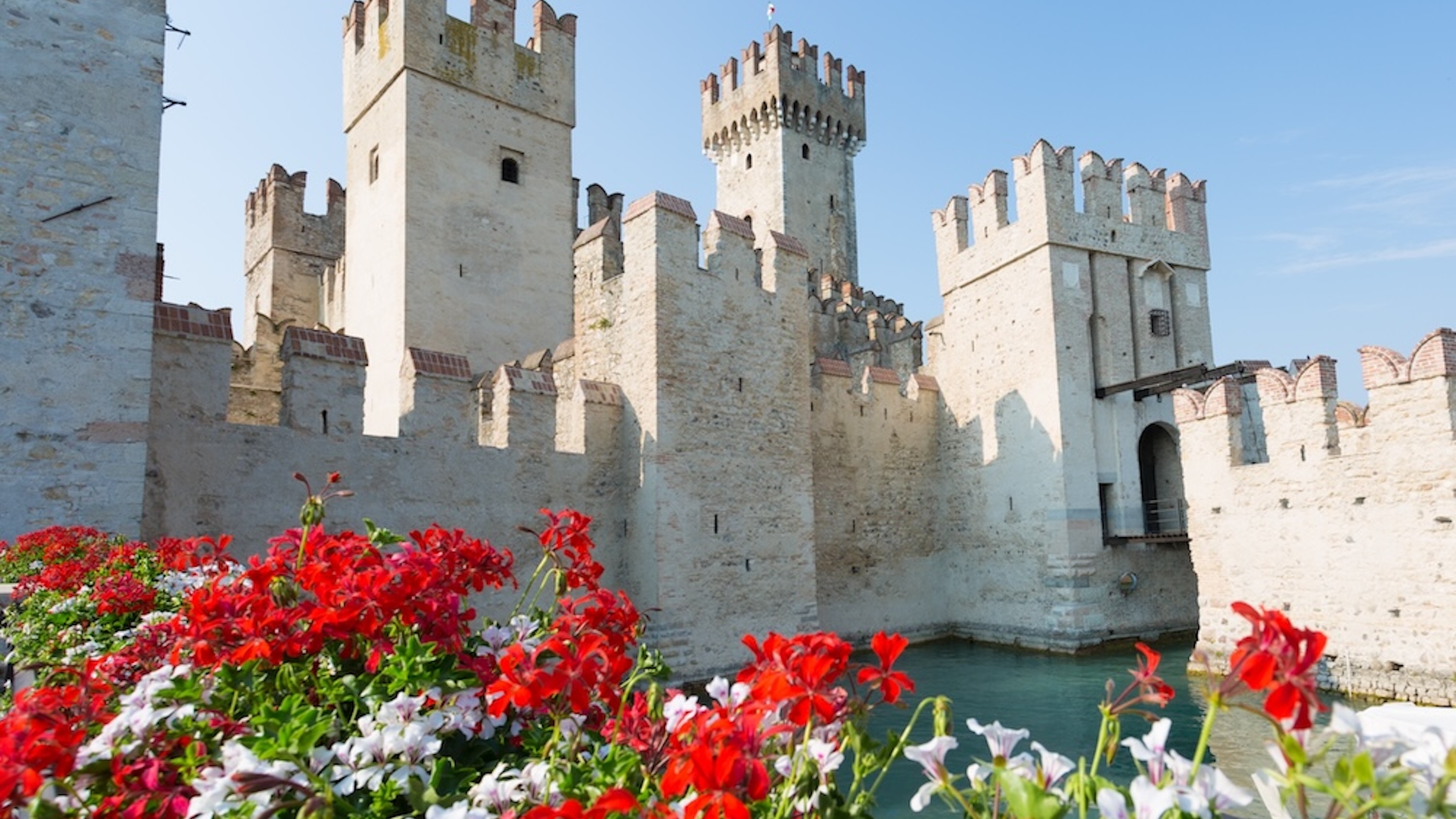 雄伟的西尔苗内斯卡利杰尔城堡,底部被鲜艳的红花环绕