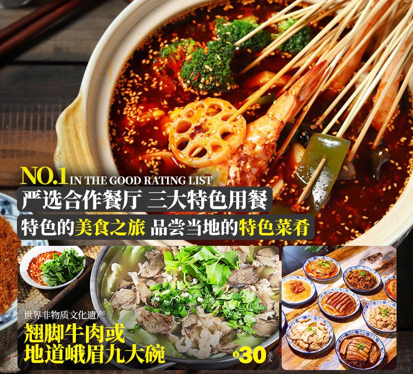 地道美食品鉴:品尝世界非物质文化遗产-翘脚牛肉或峨眉地道九大碗(根据实际情况2选1安排);