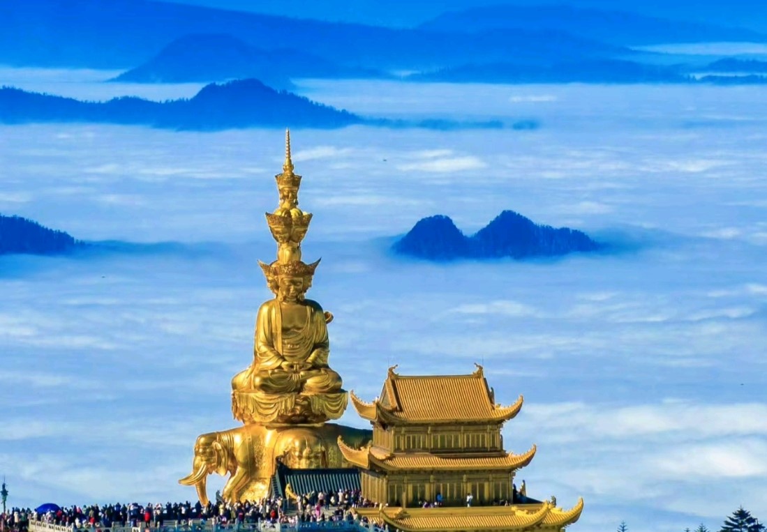 游金顶华藏寺金殿,银殿,铜殿等。后原路乘索道下行至接引殿返回至雷洞坪停车场乘坐景区观光车到达万年停车场。