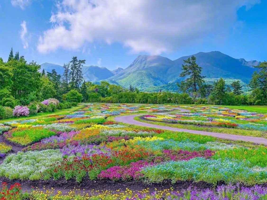 久住花公园位于大分县竹田市的久住高原,是阿苏国立公园的一部分。这里以久住连山和远处的阿苏五岳为背景,四季都有美丽的自然风光。从春天到秋天,公园里约有500种300万株鲜花盛开。最佳的观赏时间是3月到11月。
