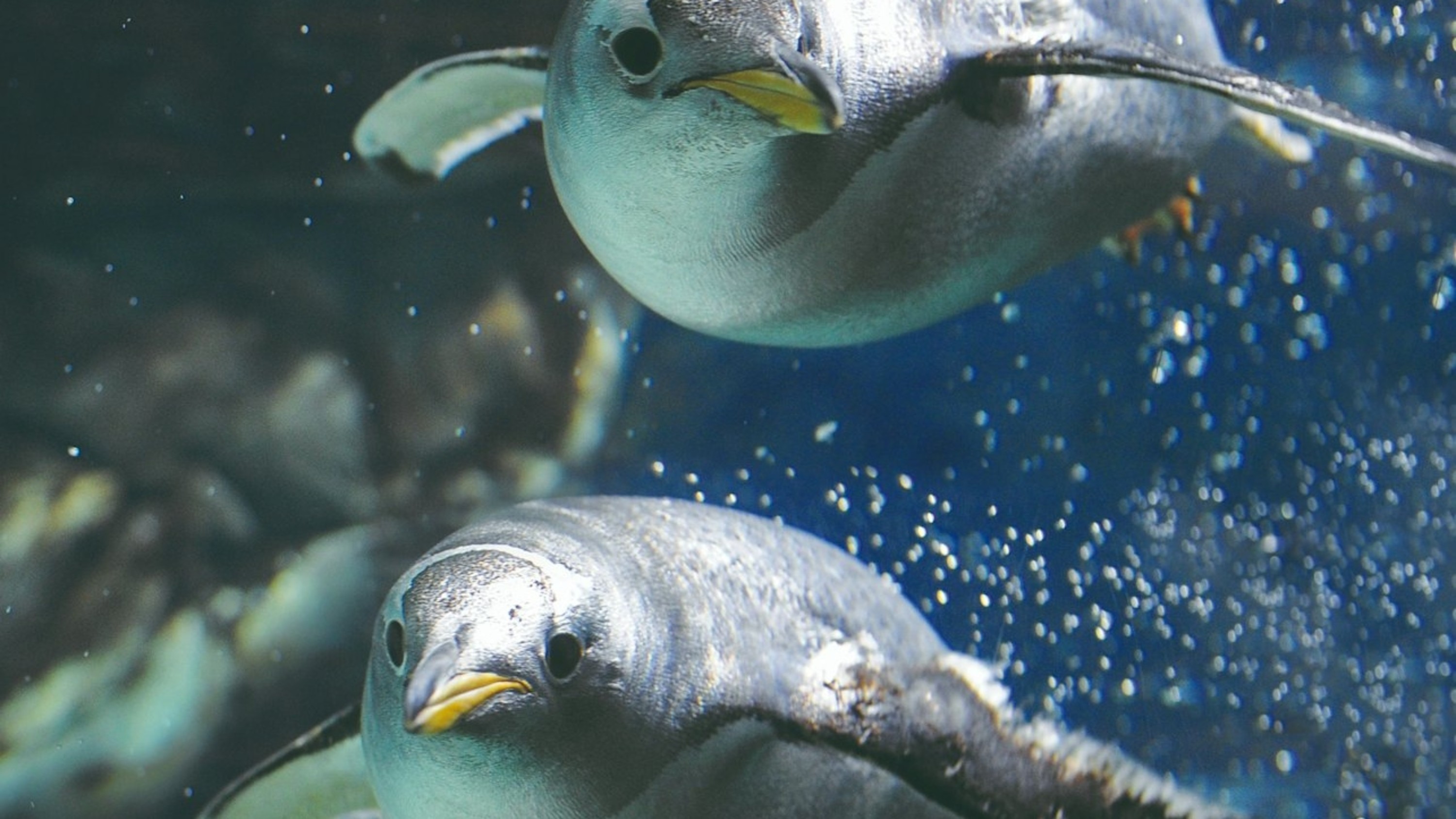 两只顽皮的企鹅在水族箱的清澈水中优雅地游动