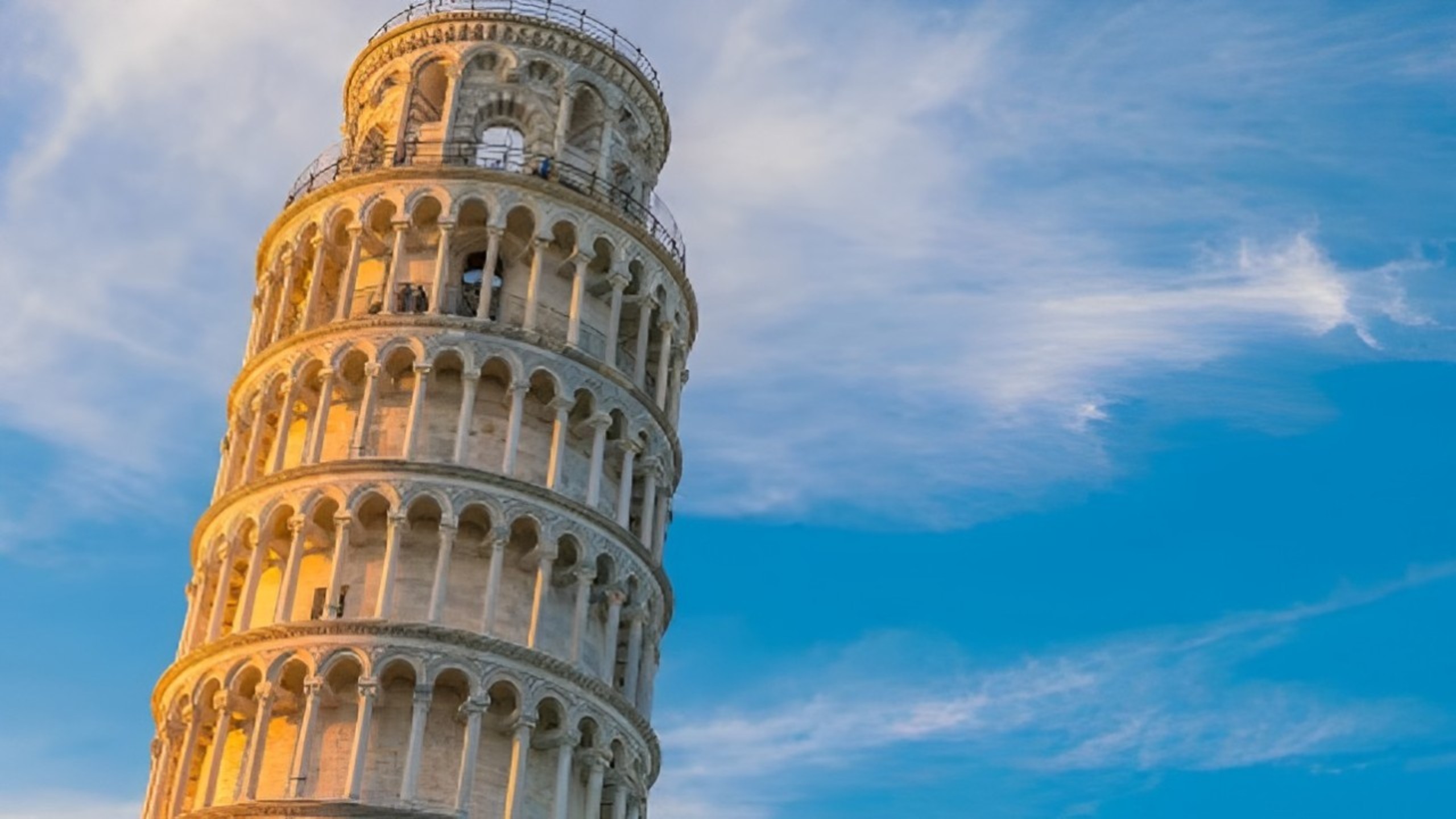 游客在明亮的蓝天下欣赏世界闻名的比萨斜塔