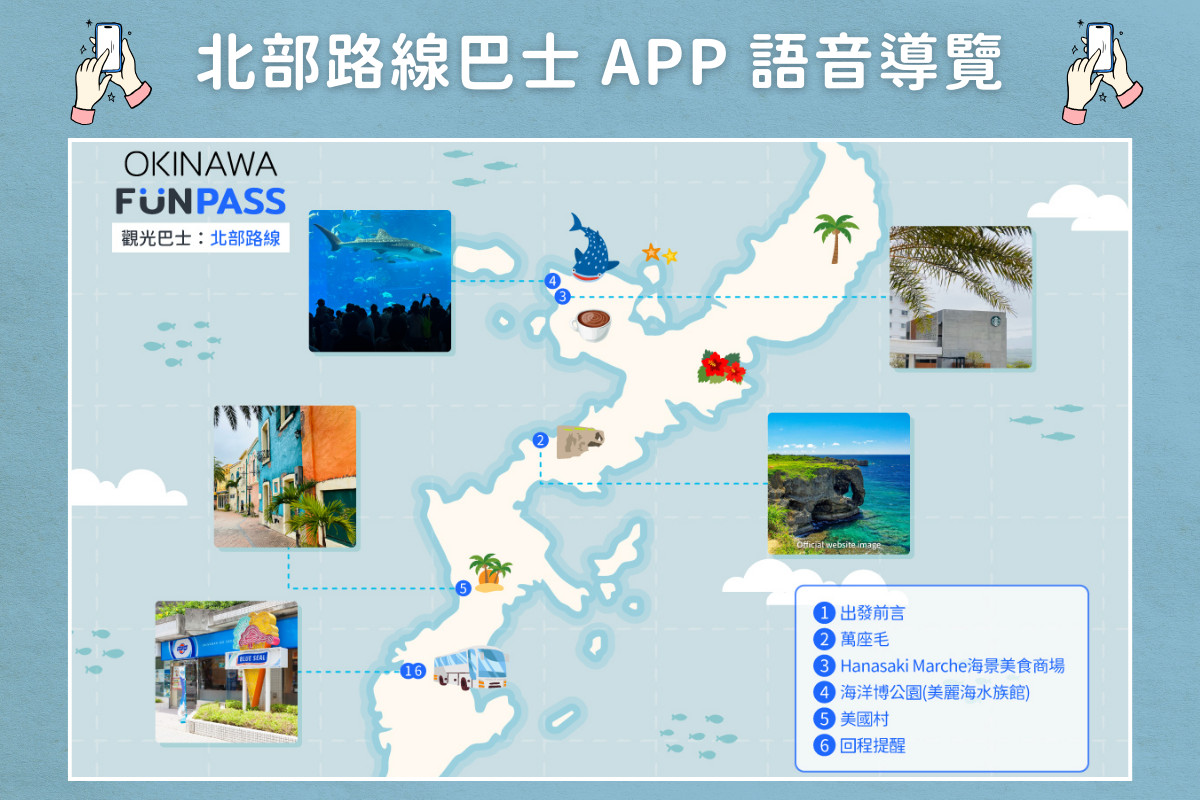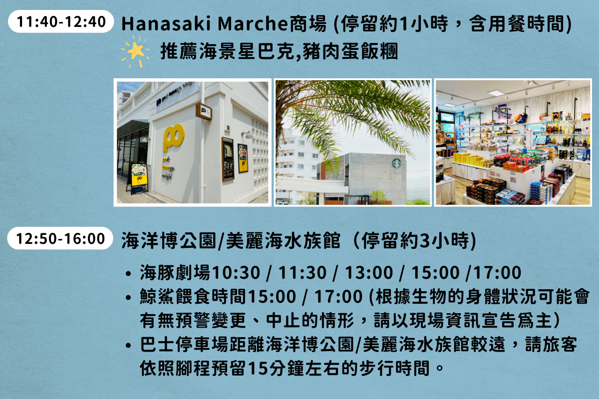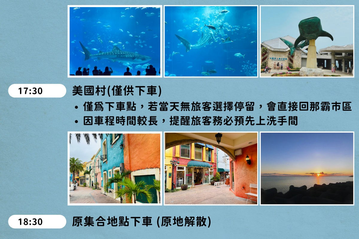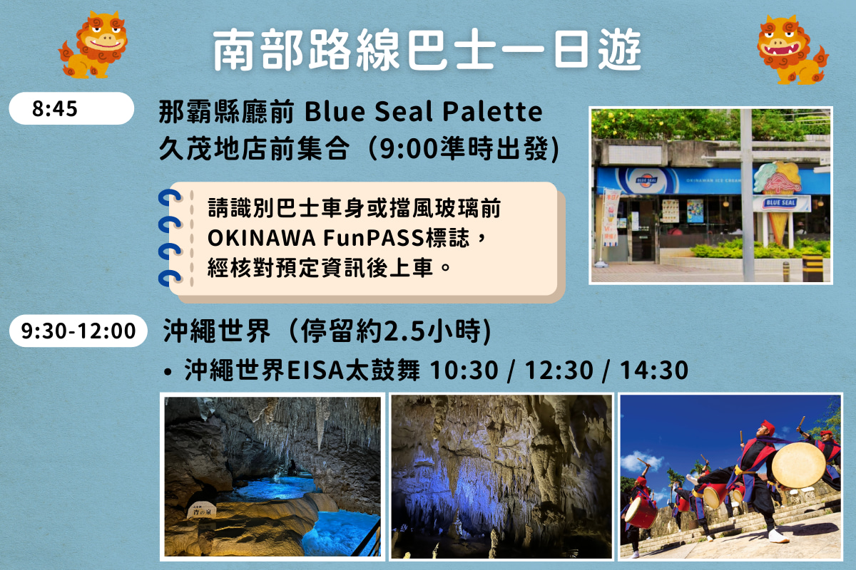 * 请于8:30至集合地点,并识别巴士车身或挡风玻璃前有Okinawa FunPASS标志,上车前请出示QRcode,经司机核对名单并确认后即可上车