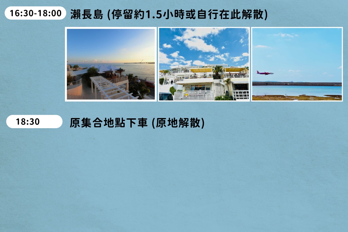 从那霸出发,首站参观融合王国村、玉泉洞与毒蛇馆的「绳世界」,为日本重要文化遗产。接着到系满鱼市场品尝新鲜海味,再前往iias丰崎商场,内有DMM Kariyushi水族馆与百余店铺如Bic Camera、LOFT等。最后造访濑长岛Umikaji Terrace,逛美食与伴手礼店,行程结束后可选择留下赏夜景或返回那霸。
