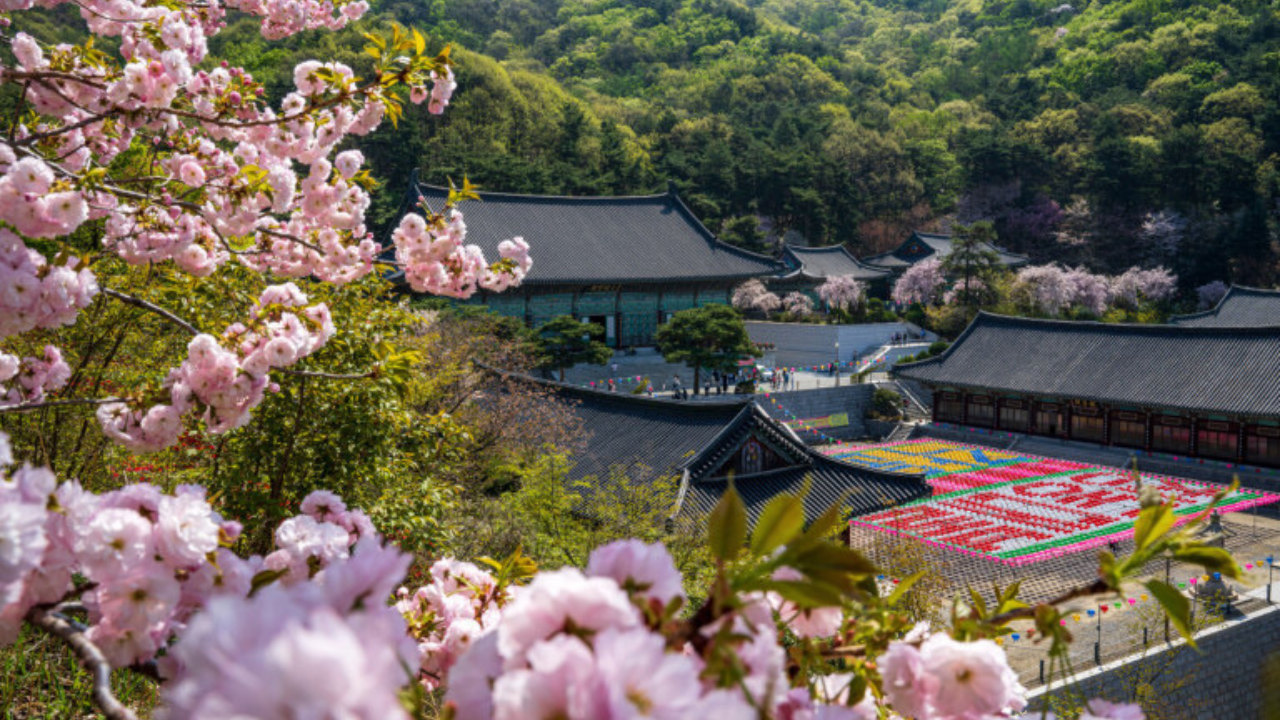 觉愿寺宁静的景色中,庄严的佛像被鲜艳的樱花和色彩缤纷的灯笼所环绕,完美地融合了灵性与春天的美丽。