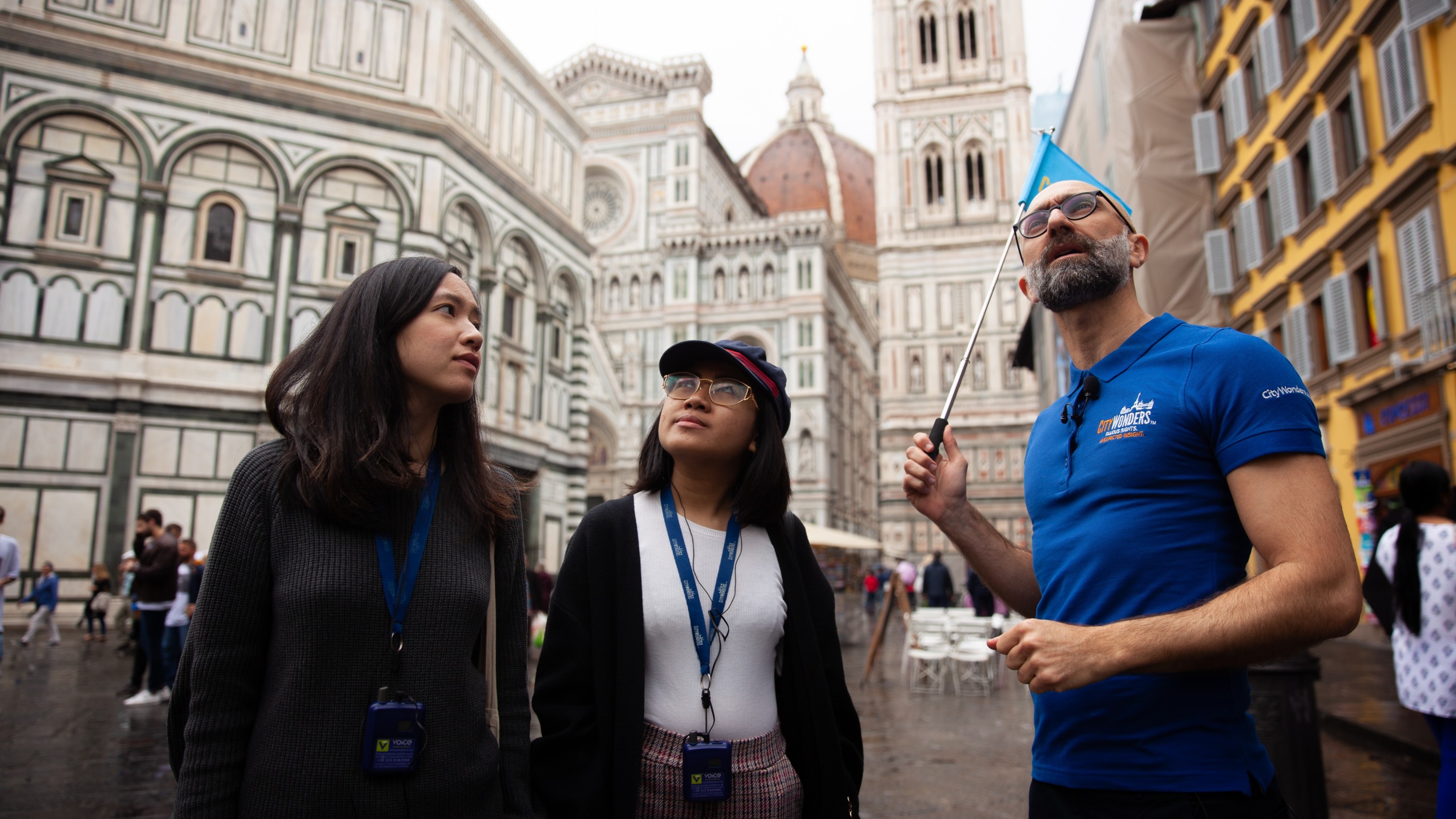 一群游客在佛罗伦萨大教堂附近听导游讲解历史