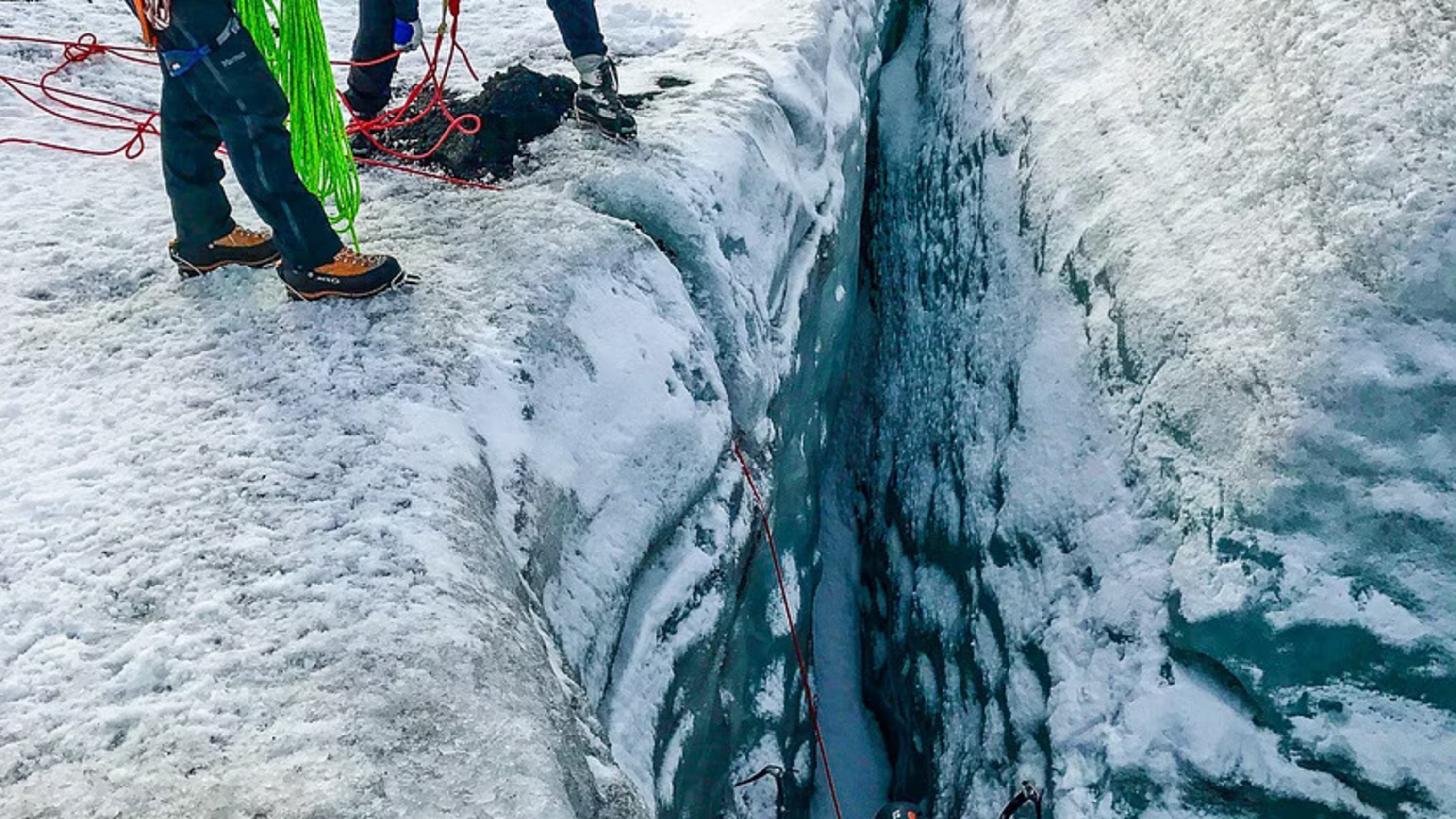 探险者在惊心动魄的冰岛冰川探险中穿越深深的裂缝