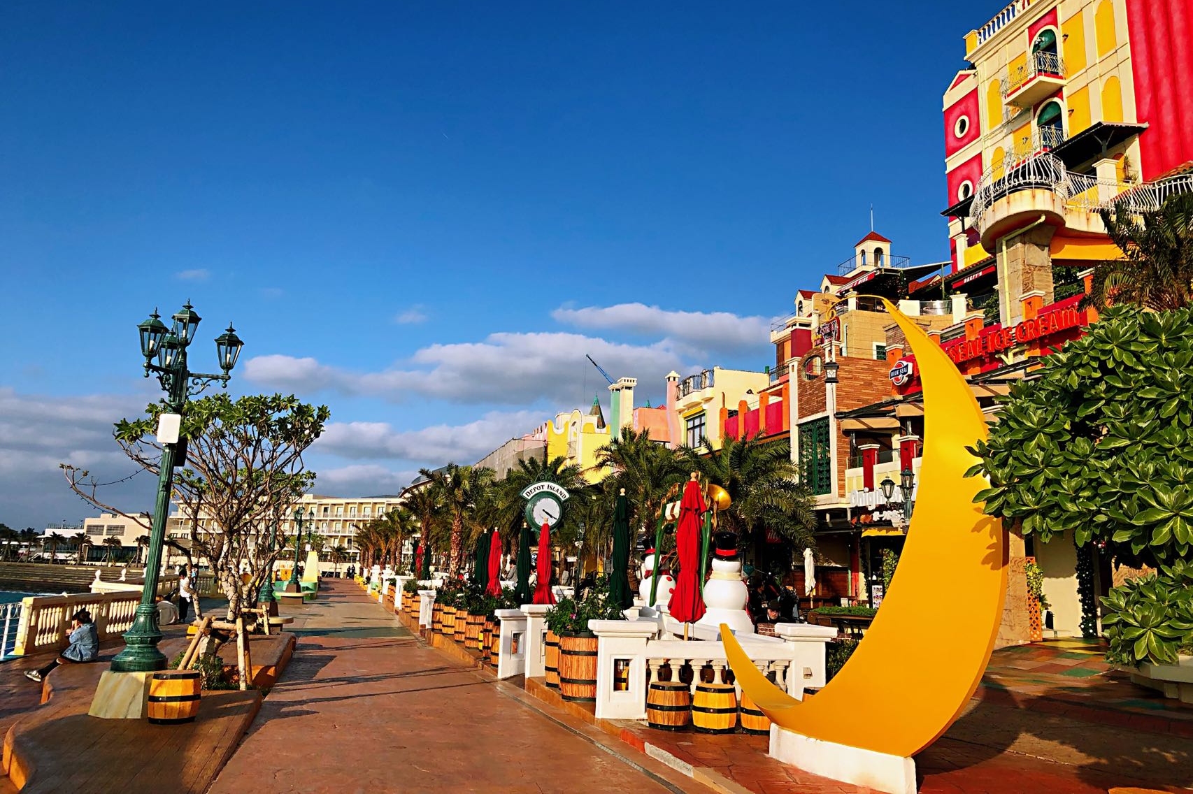 美國村的「日落海灘」能欣賞到美麗夕陽和晚霞,靠海區也有非常多特色餐廳和咖啡店,漫步在沙灘或河堤上格外愜意。