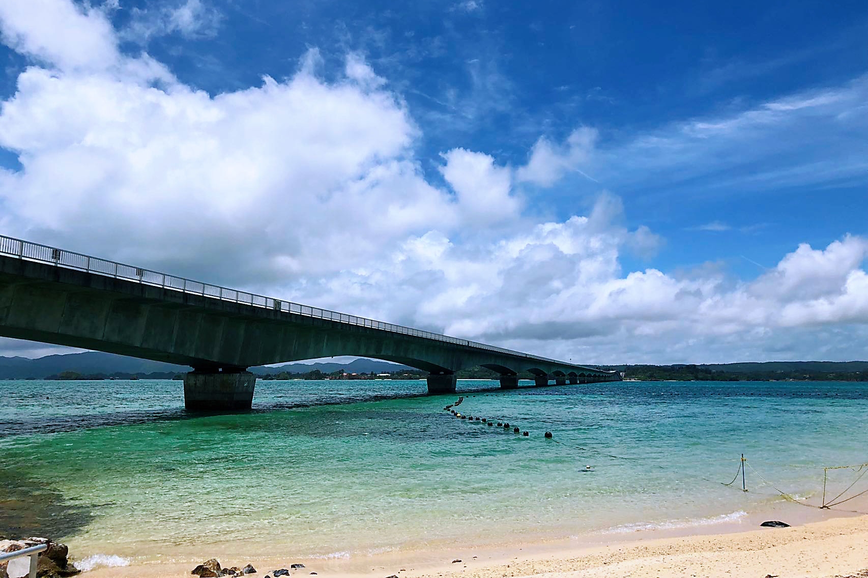 古宇利大橋除了車輛可行駛之外,也有設置人行道,可在橋上欣賞漸層琉璃般的碧藍色海水。也可以到島上最受歡迎的古宇利海灘,踩上細白的沙灘,踏一踏清澈的海水!