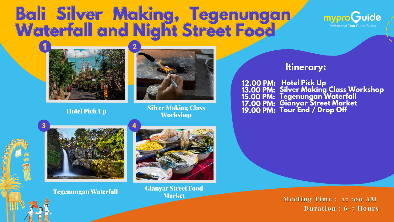 首先参观传统的银器制作工坊,欣赏技艺精湛的工匠制作精美的银饰,甚至还可以尝试亲手制作一件。然后,前往令人叹为观止的Tegenungan瀑布,瀑布周围环绕着郁郁葱葱的热带植物,是沉浸于巴厘岛自然美景的绝佳去处。夕阳西下时,前往吉安雅街头美食市场,感受充满活力的当地生活,感受岛上鲜为人知的烹饪秘诀。