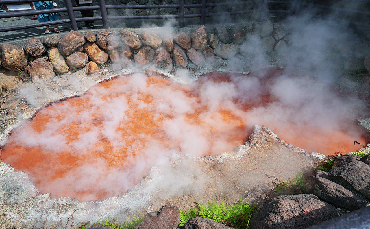 猛烈的喷气与高热温泉的涌出是地狱泉温高达90度。
