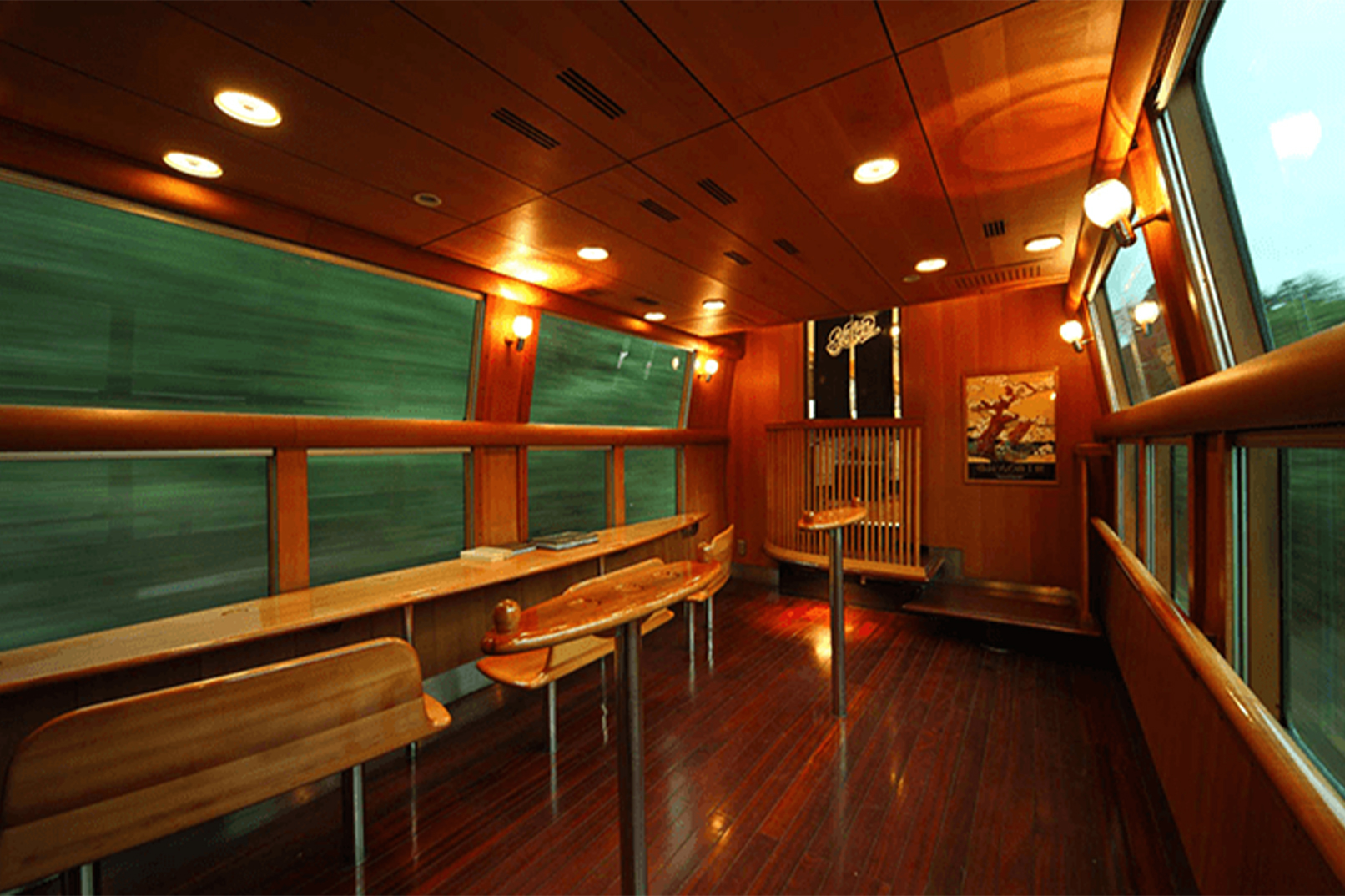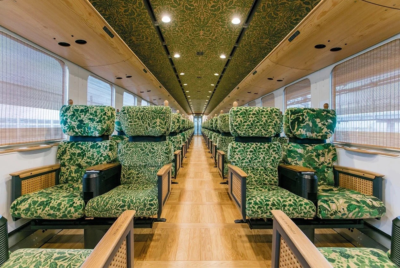 由布院之森号:融入自然风景的车厢装潢。木地板、绘满树叶的丝绒座椅呼应了列车途经的森林风光,有着自然的格调。