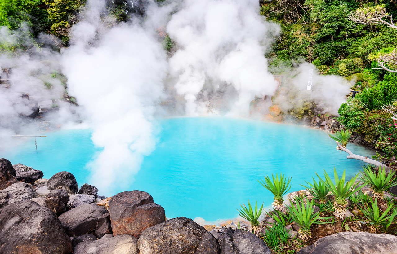 「别府地狱ー海地狱」 别府是日本第一出水量的温泉区,来到别府不可错过别府的周游地狱之旅,8所地狱中的“海地狱”是规模最大的别府地狱,距今1200年前鹤见岳爆发时形成的,充满神秘的瓷蓝色池水