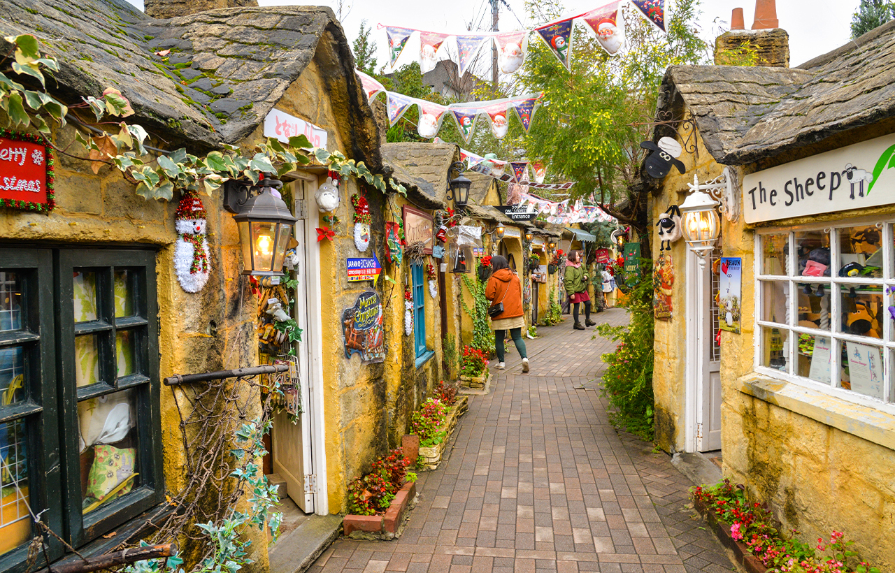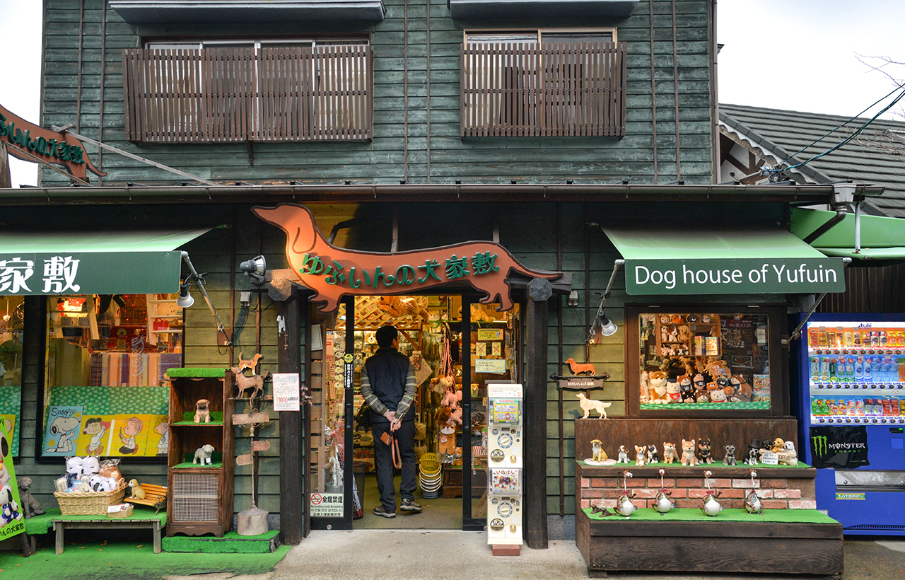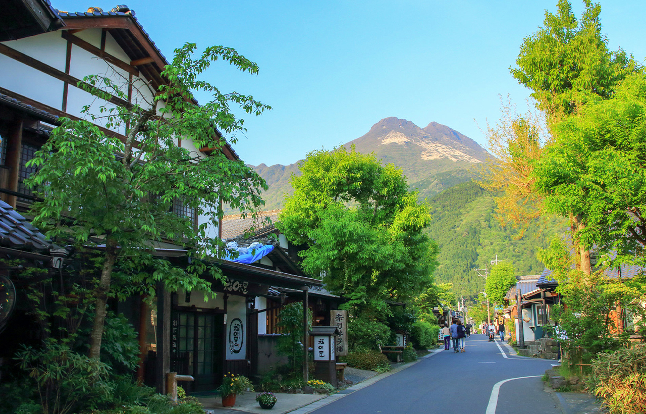 由布院:街道两旁林立着售卖柚子胡椒等大分特产的纪念品店,以及供应炸鸡天妇罗等当地美食的餐厅,游客络绎不绝。