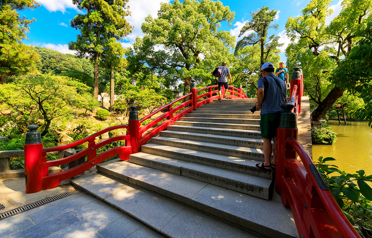 太宰府天满宫:朱漆外观的御本殿及周围的神苑之外,天满宫内还分布着天开稻荷社、宝物殿、菅公历史馆等很多历史建筑。四季风情种种,有列入天然纪念物的阔叶厚壳树及樟树,还有梅花、花菖蒲等次第华美绽放。