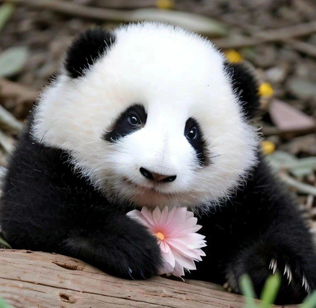 熊猫宝宝攥着粉嫩野花,黑白绒毛在阳光下泛着细软银光,眼神清澈得能映出竹叶晃动的虚影。背景虚化的绿意裹着青草香,仿佛伸手就能触到它掌心的花瓣绒毛