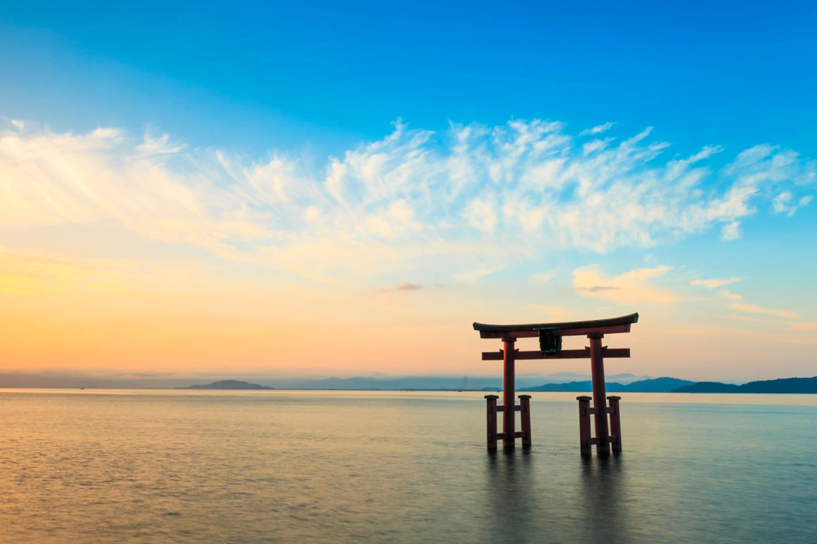 * 第一站:**琵琶湖白须神社**。它可是离神明最近的传说,1900 年前建成的白须神社,古老又神秘,入选日本遗产。在这里,无论天晴或起风,鸟居都美得独特,想拍绝美大片,就去蓝湖白须台,轻松拿捏氛围感!