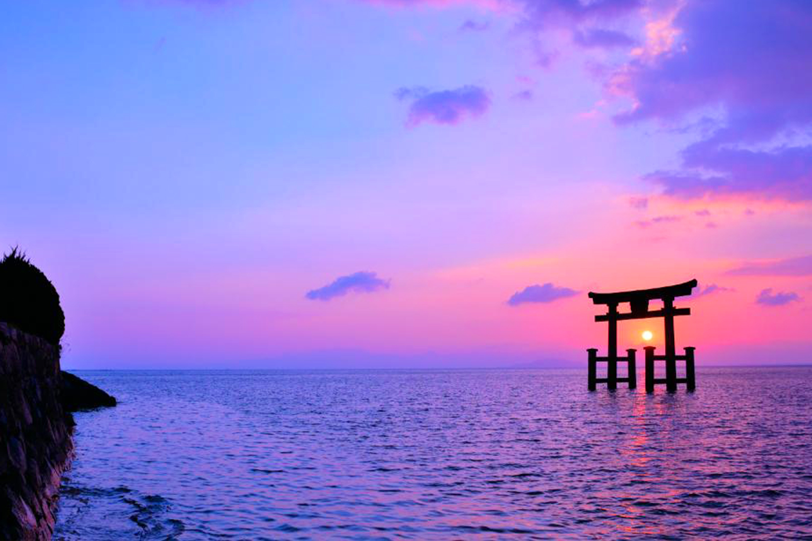 白须神社的水上鸟居就静静地伫立在琵琶湖中,以不变应万变,朝飞暮卷、碧空如洗、风云变换、斗转星移,呈现出各不相同的景象,得到无数摄影爱好者的青睐。