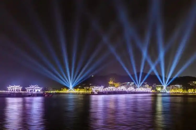 当最后一缕夕阳隐没于地平线,充实的潮州之行在白天的探索后,迎来了夜晚的别样精彩。结束了对众多古迹与特色景点的深度游览,我们迎来了“凤城之光灯光秀。夜幕降临潮州古城褪去了白日的喧嚣,华灯初上,韩江两岸瞬间被璀璨的光芒点亮。伴随着悠扬的音乐,“凤城之光”灯光秀绚丽开场。五彩斑斓的灯光在韩江水面上跳跃闪烁,与波光粼粼的江水相互映衬,灯光不断变幻时而化作历史的画卷,展现潮州千年的沧桑变迁;时而化作灵动的音符,奏响这座城市的文化乐章。待灯光秀缓缓落下帷幕,我们带着满满的美好回忆,在夜色中被送回温馨的酒店。