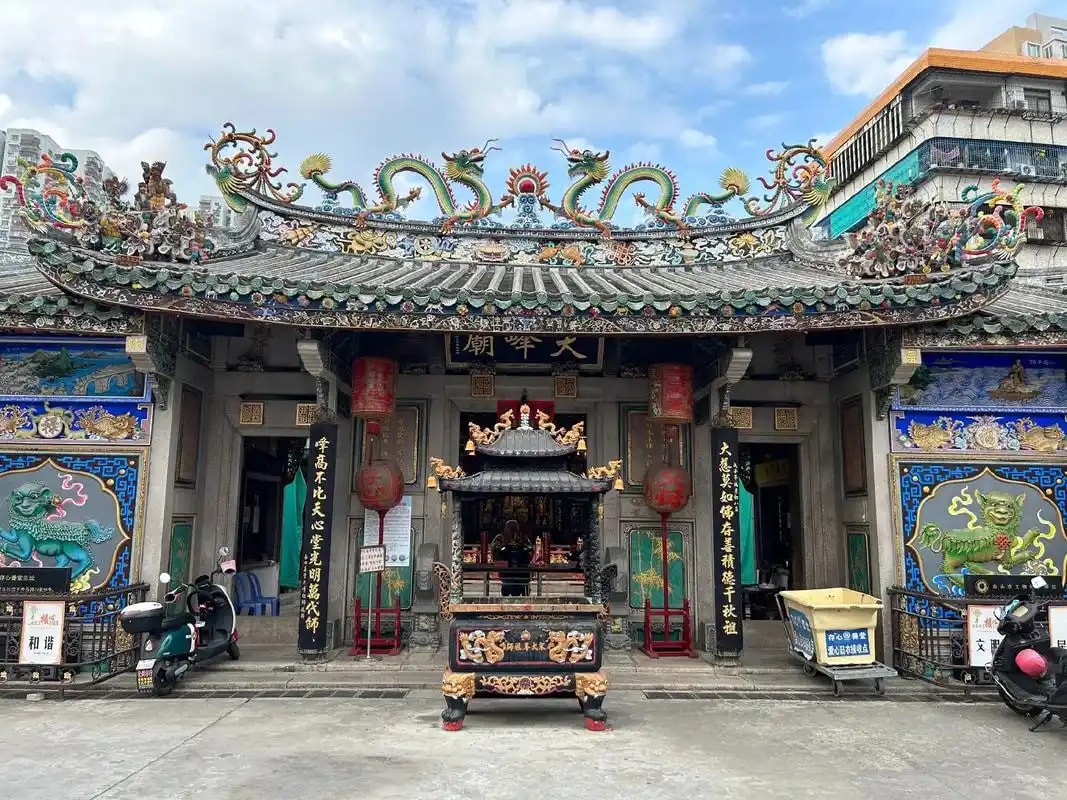 沿着开元寺的中轴线继续前行,在大雄宝殿之后,一座宏伟而庄严的建筑 —— 大悲殿,大悲殿的建筑风格融合了传统佛教建筑的精髓与潮州当地的特色元素,气势恢宏,美轮美奂。殿宇采用了重檐歇山顶的形式,飞檐翘角高高扬起,那层层叠叠的屋檐,如同绽放的莲花,细腻而优雅,展现出一种超凡脱俗的美感。正脊之上,精美的装饰令人叹为观止,双龙戏珠的雕塑栩栩如生,两条巨龙身姿矫健,威风凛凛。殿身的外观庄严肃穆,红墙黛瓦相互映衬,色彩对比鲜明而和谐。墙面采用了古朴的红砖砌成,历经岁月的打磨,显得格外厚重而沉稳。