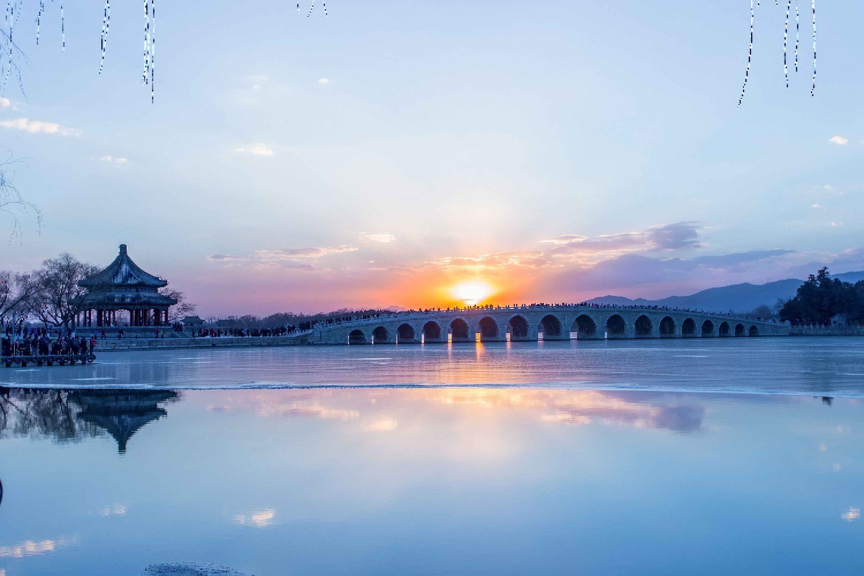 颐和园主要景点——十七孔桥,连接昆明湖东岸与南湖岛,桥身由十七个发券孔组成,桥栏望柱上雕有 500 多只形态各异的石狮子。