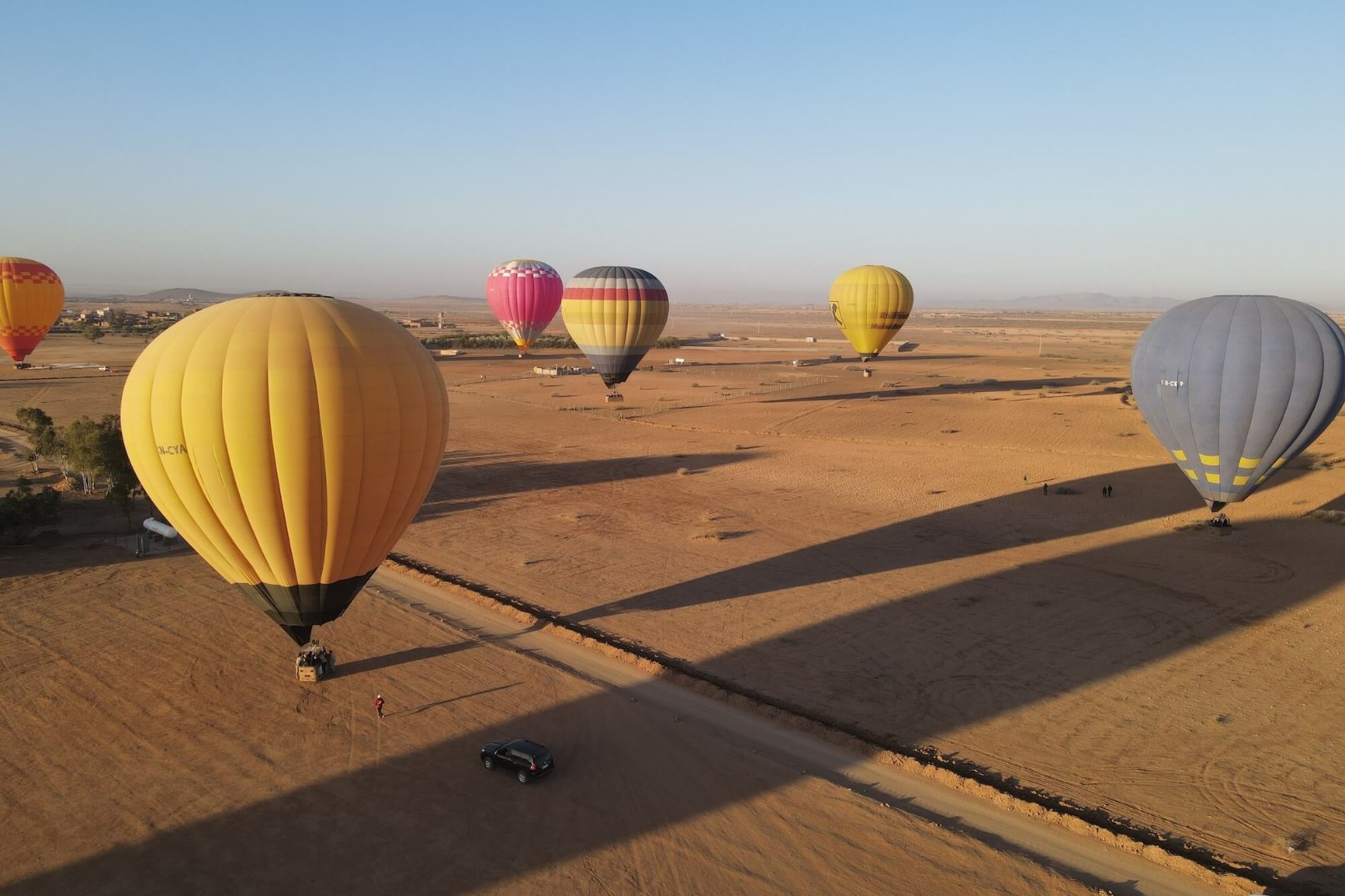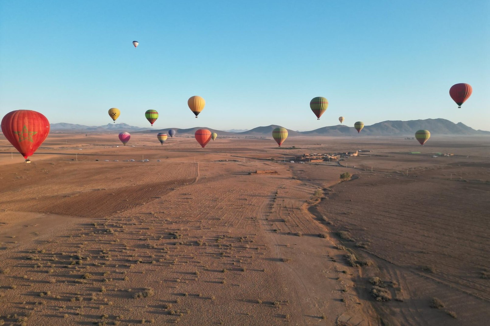 乘坐热气球飞越马拉喀什北部的棕榈园。从马拉喀什市中心的住宿处出发,驱车 30 分钟即可抵达营地,参加安全简报会。飞行前,您将享受热情的茶、咖啡和羊角面包。
