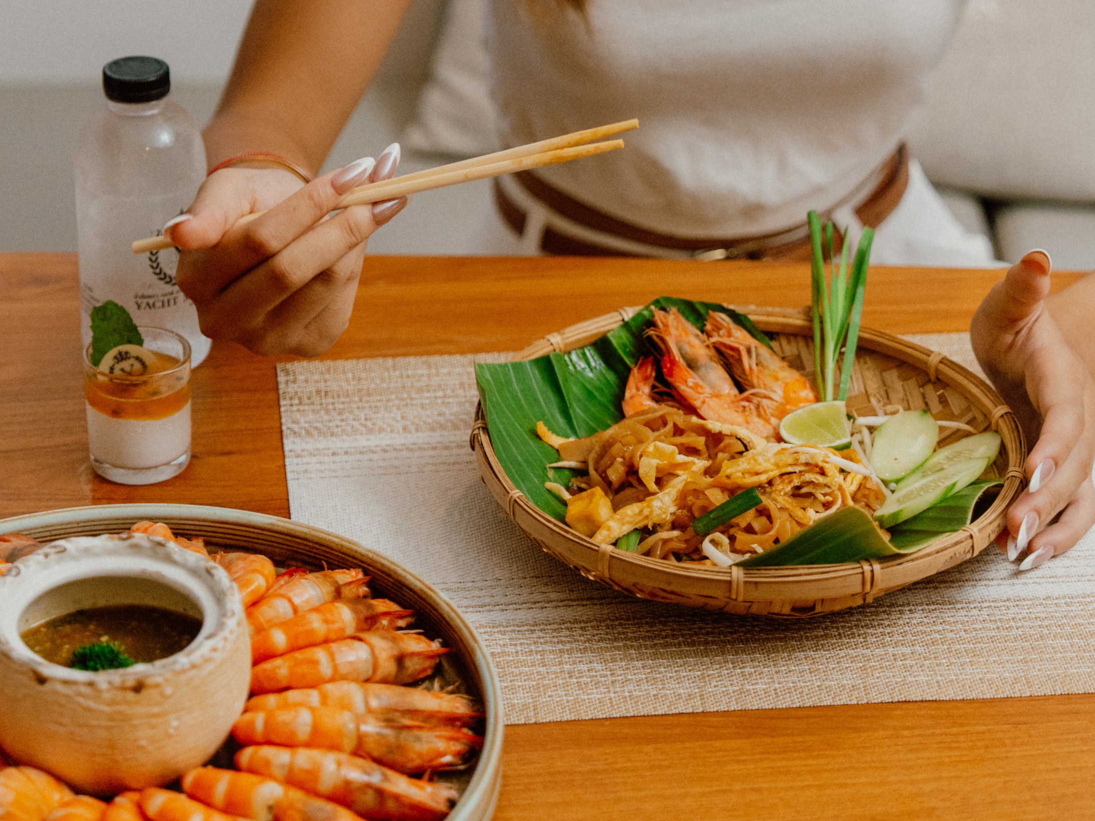 享受日落之旅的晚餐,品尝我们的盐焗虾和泰式炒河粉套餐