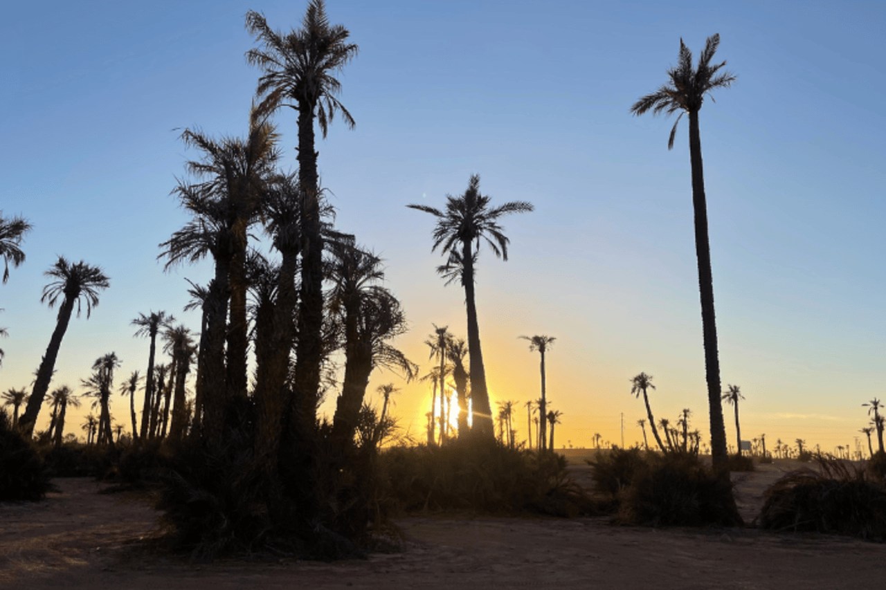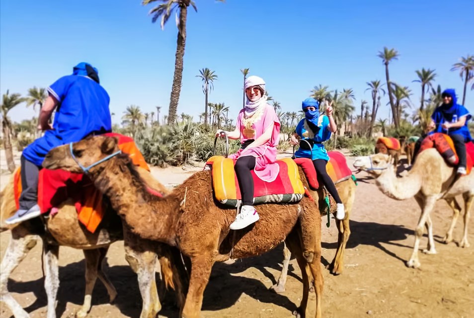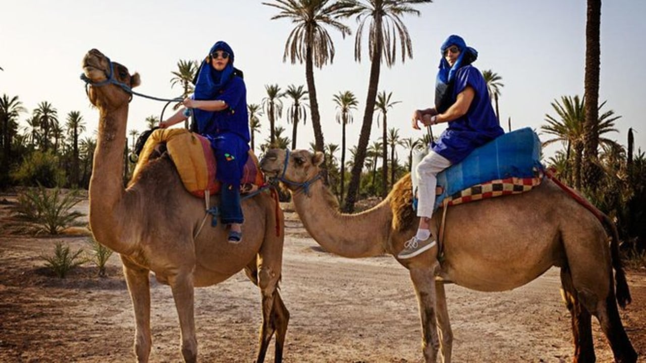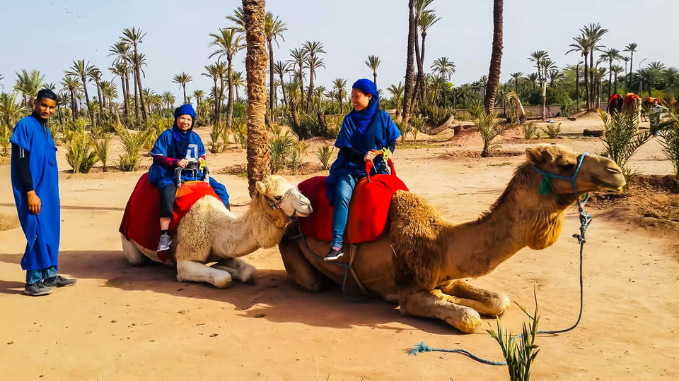 从马拉喀什的酒店接您,欣赏棕榈园绿洲的修剪整齐的花园、香气扑鼻的橘子树和棕榈树林。在驯马师的陪伴下骑上骆驼。