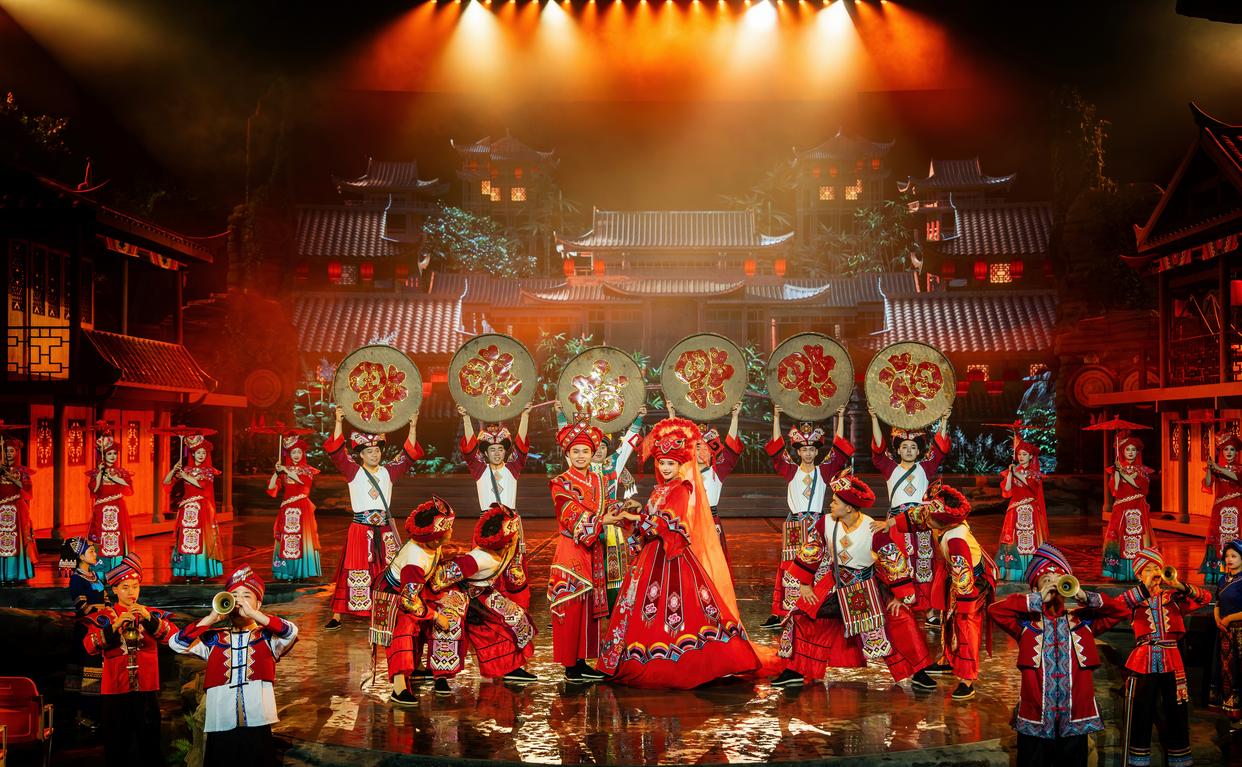 原生态洞穴剧场, 每天上演大型原创土家族情景歌舞《夷水丽川》,演绎在腾龙洞景区一带生息繁衍土家族民族文化的精华。