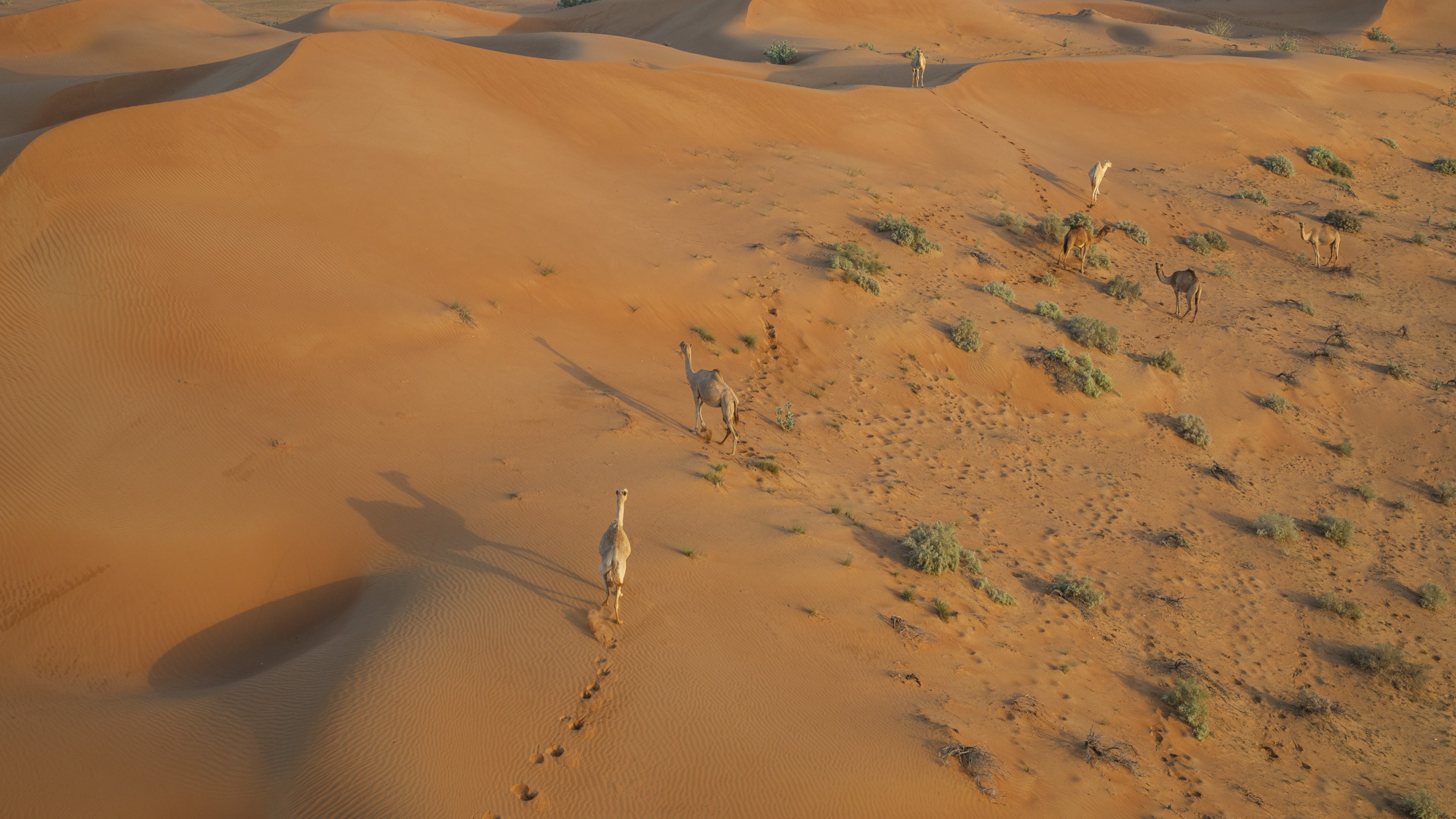 骆驼在金色沙漠中自由漫步,在柔软的沙滩上留下足迹