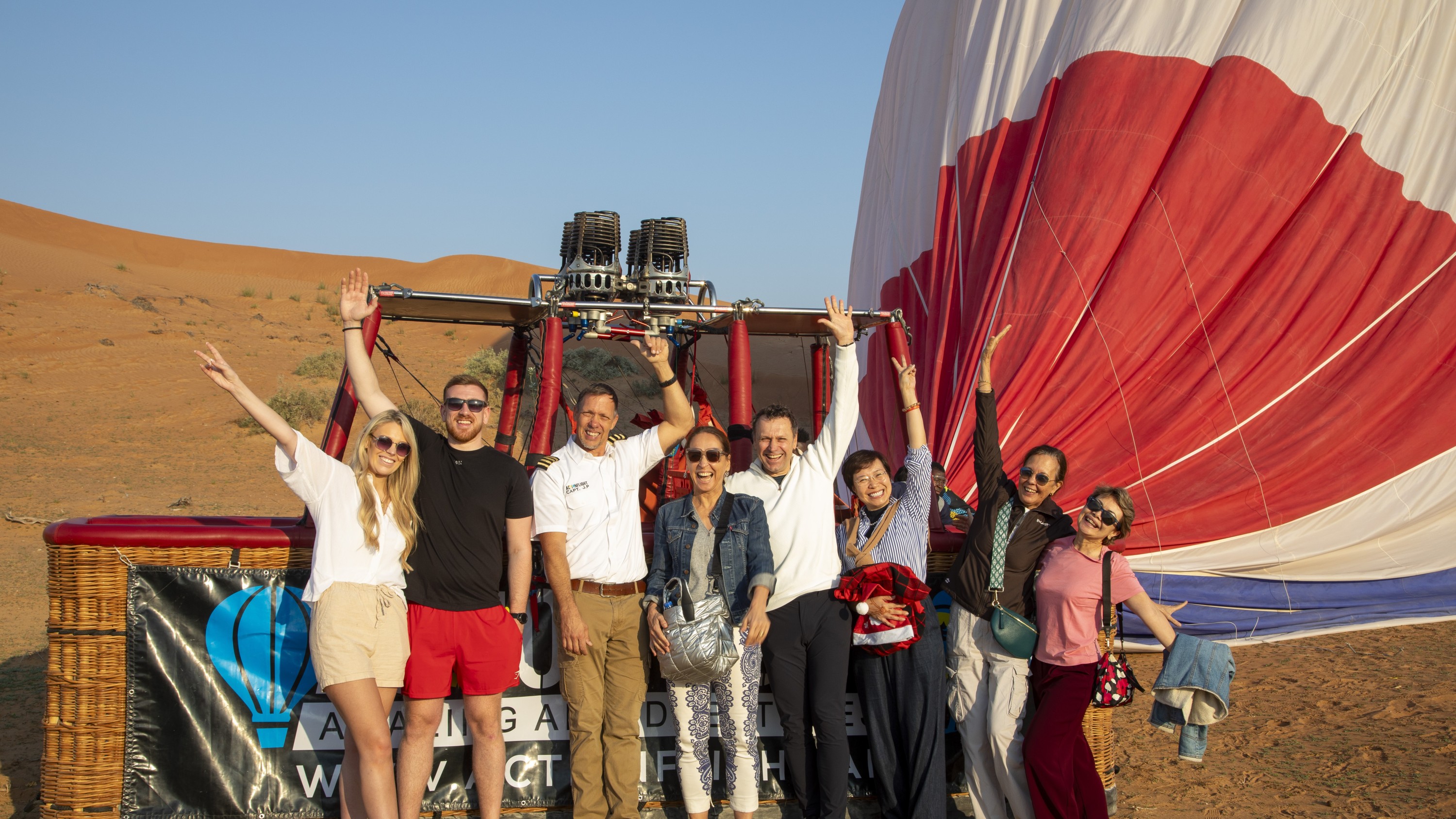 一群快乐的人庆祝他们难忘的沙漠热气球冒险之旅