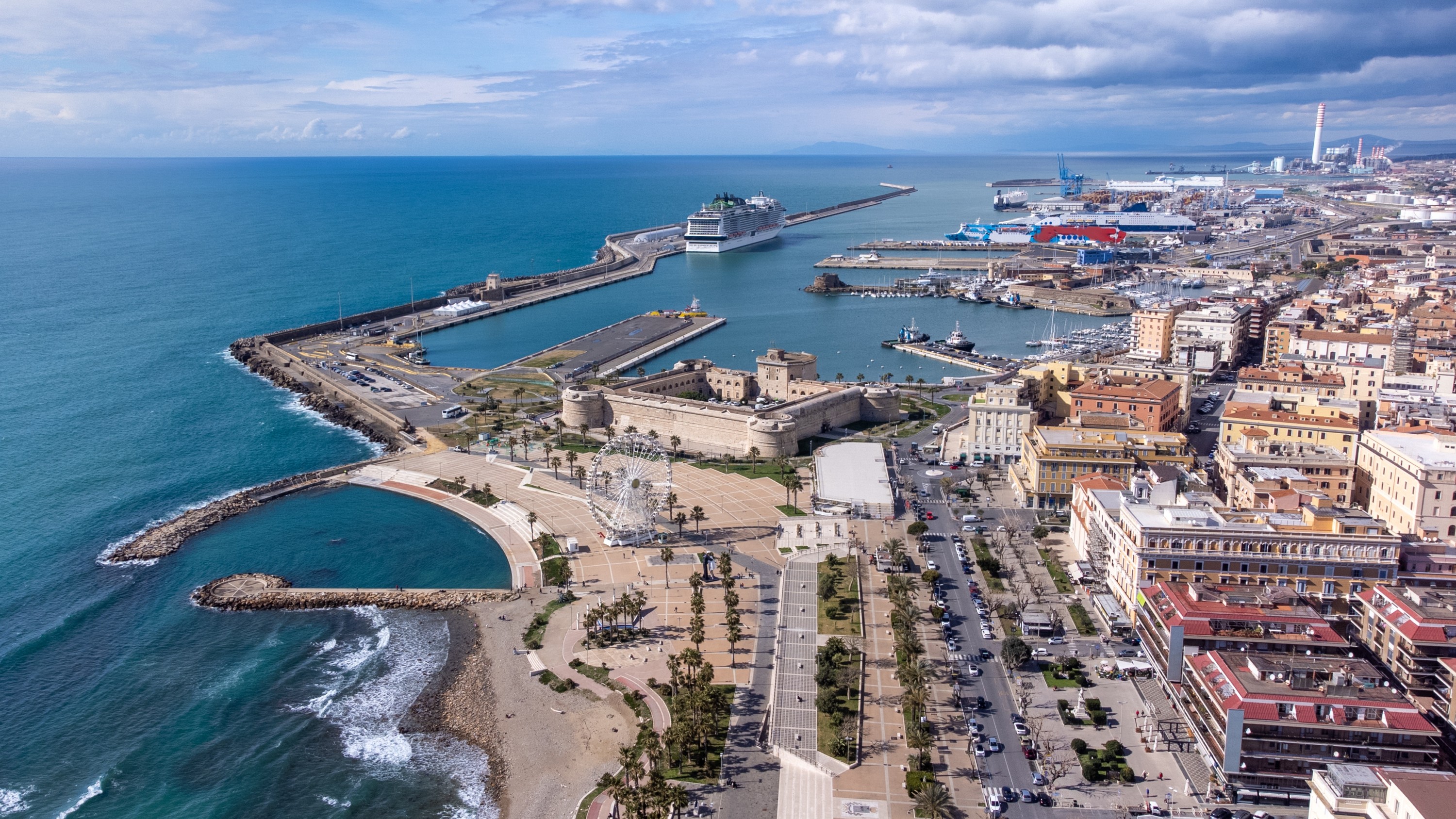 奇维塔韦基亚港在阳光下闪闪发光,船只安静地停靠在附近