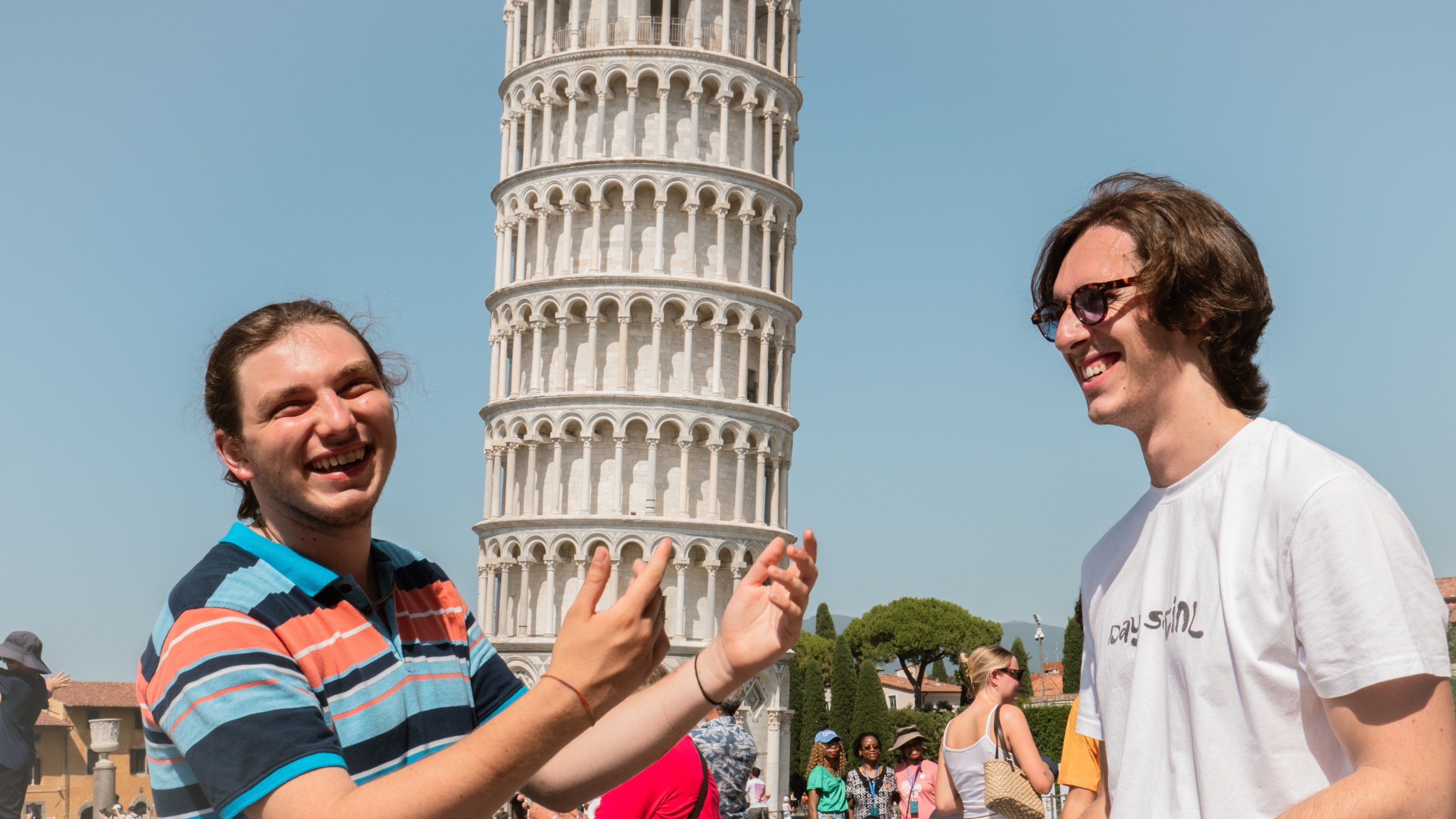朋友们在著名的比萨斜塔前开心地合影