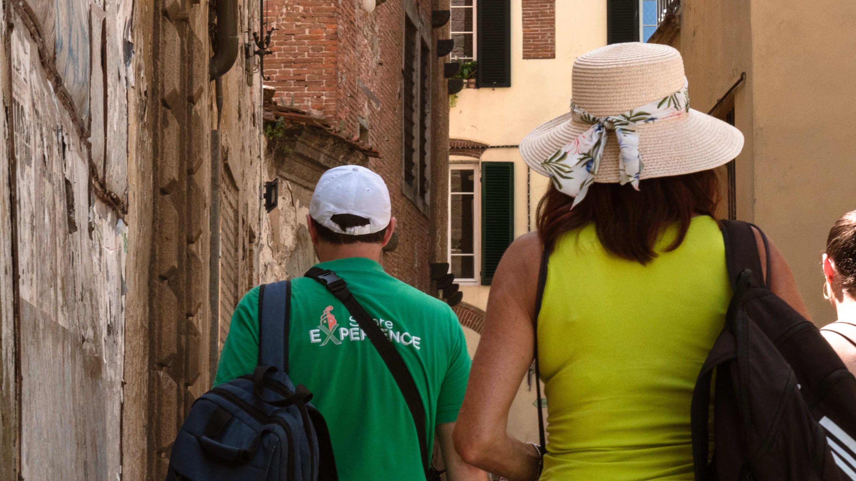 团队步行穿过 Borgo Stretto,周围环绕着迷人的中世纪建筑和商店