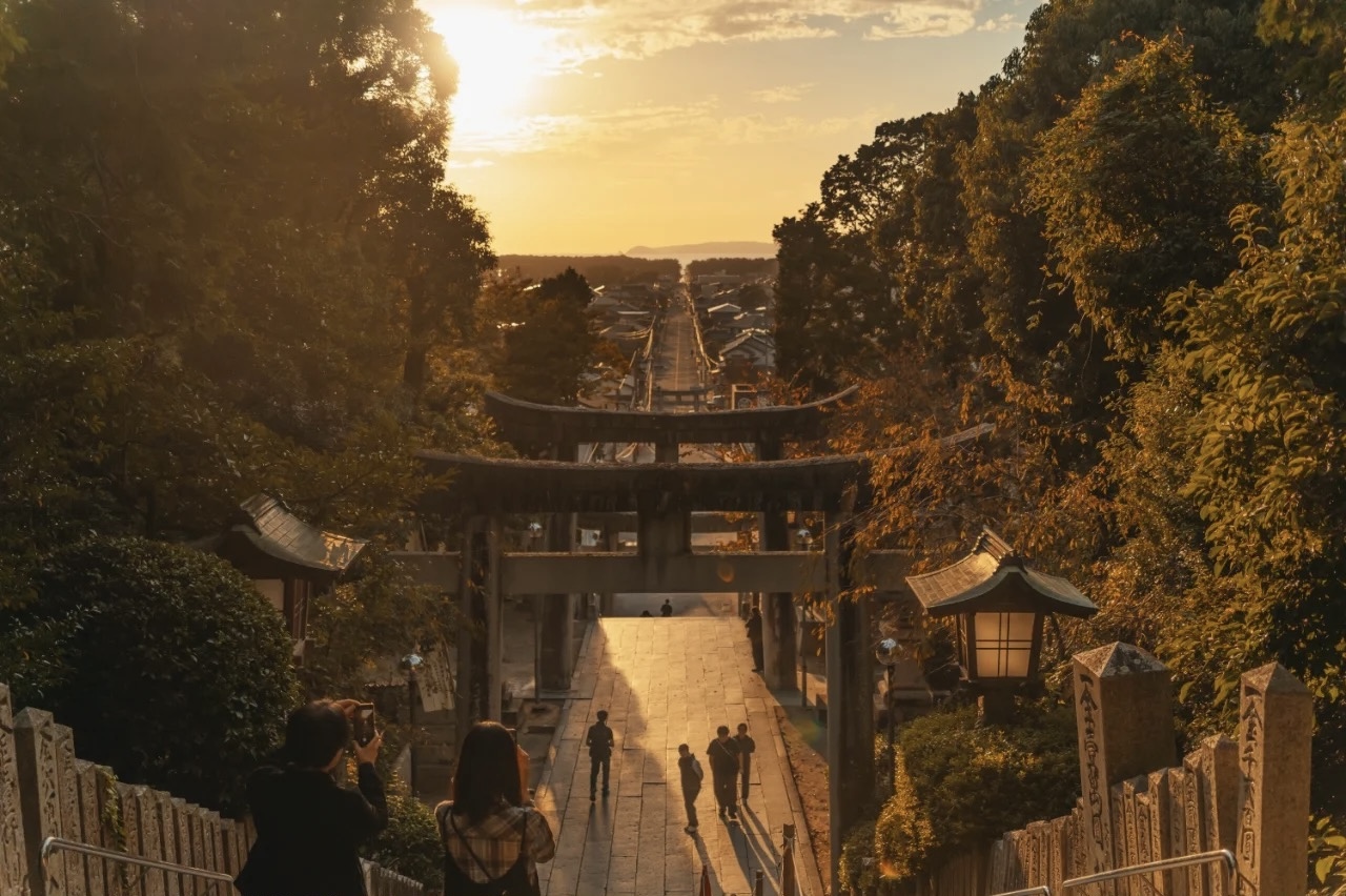 在宫地岳神社有着美如油画般的光景,夕阳西下落在长长的参道,像一束通往未来奇迹的光道。日语里有个词语一期一会,所有的相遇都是唯一,你看到的是只属于你的「光之道」。站在神社的台阶上,看着这如真如梦的景色,笔直的参道一直通向广阔的海面,金色的夕阳普照犹如送来最美丽的祝福。